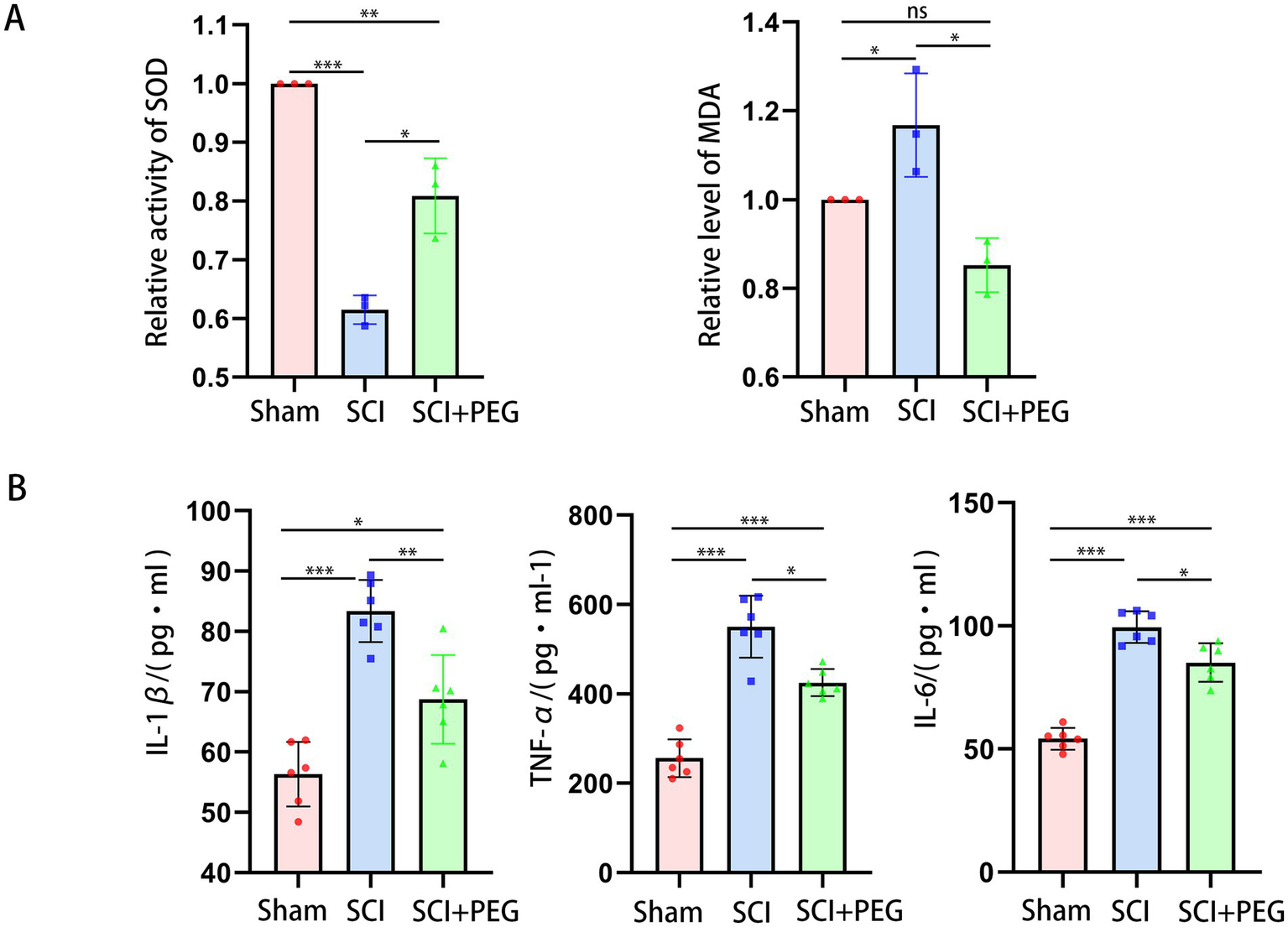 Figure 3. PEG alleviates oxidative stress and inflammation after SCI. (A) The activity of SOD and MDA levels in spinal cord tissues in the different groups. n = 3/group. (*p < 0.05; **p < 0.01; ***p < 0.001). (B) Representative images of B displayed the level of IL-1β, IL-6, and TNF-α in the spinal cord. n = 6/group. (*p < 0.05; **p < 0.01; ***p < 0.001). All data are presented as mean ± SD. Statistical analysis was performed with one-way ANOVA and Kruskal–Wallis H test.