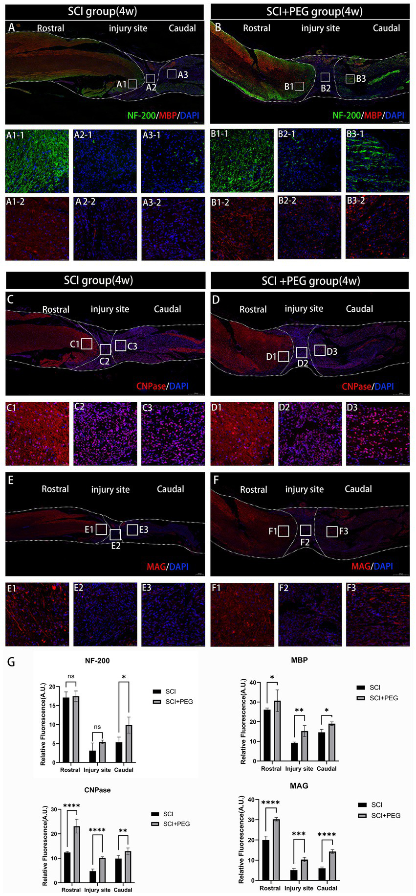 Figure 4. PEG promotes axonal regeneration after SCI. (A,B) Double-fluorescence staining analysis for NF-200 (green)/MBP (red) in the injured spinal cord. (C–F) Immunofluorescence method to observe CNPase and MAG positive expression in the spinal cord of mice in SCI group and SCI + PEG group. The stronger the fluorescence response, the higher the protein expression. n = 5/group. Scale bar: 500 μm (inset: higher magnification; scale bar: 50 μm). (G) Expression trends of NF-200, MBP, CNPase and MAG in spinal cord tissues stained by immunofluorescence. n = 3. (*p < 0.05; **p < 0.01; ***p < 0.001; ****p < 0.0001).