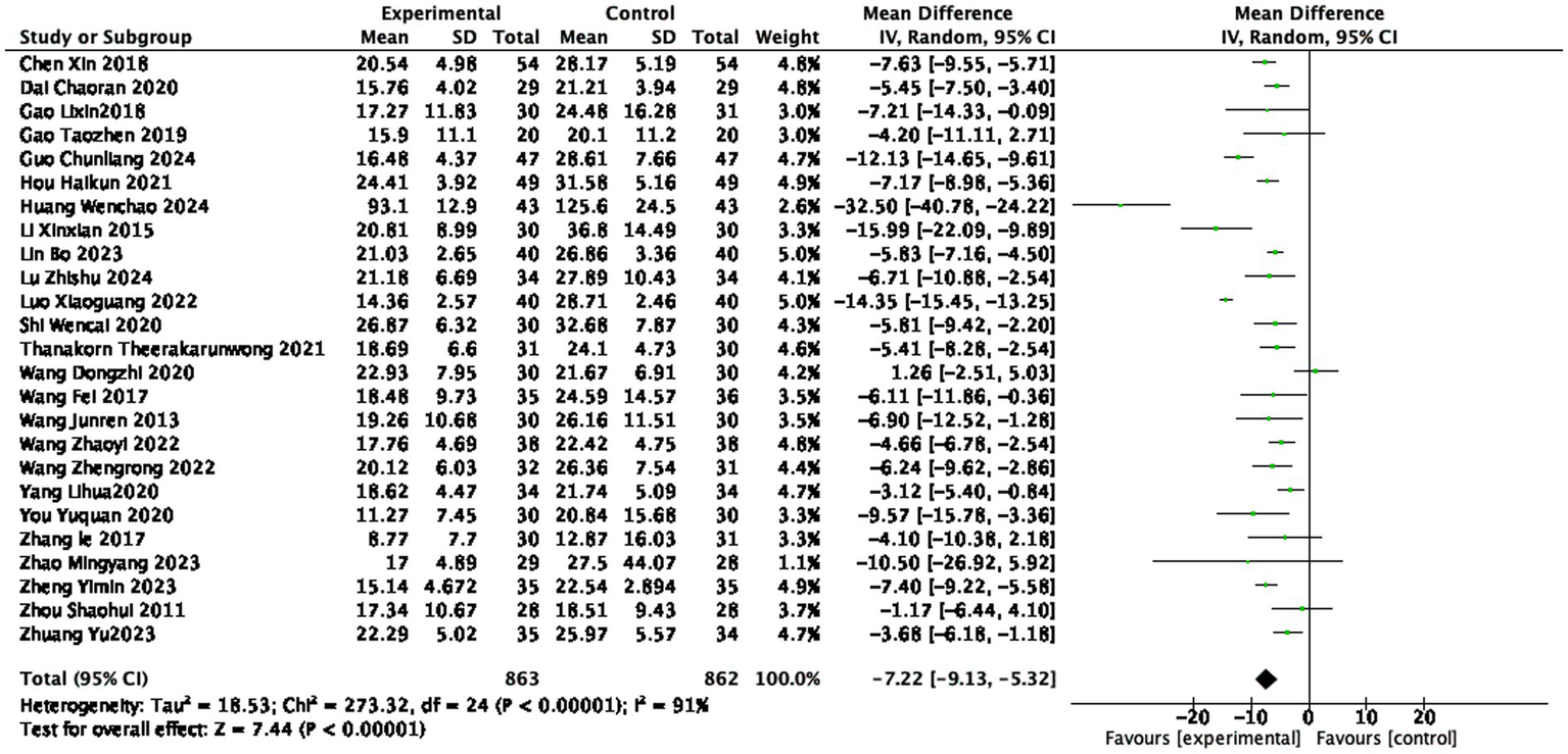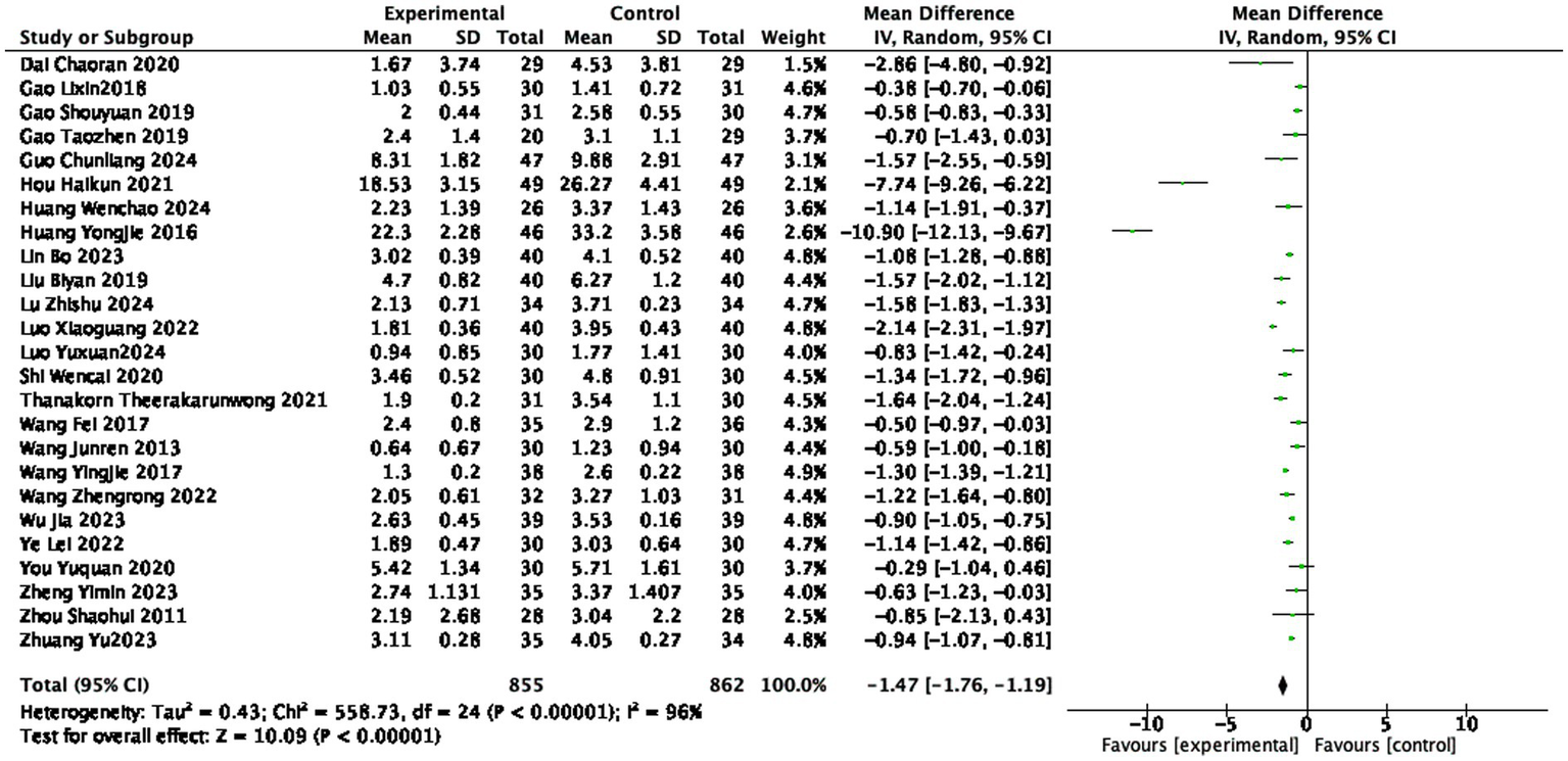 Among the included studies, five studies were three-arm trials, with TCM, Western medicine, and acupuncture used as mutual controls (19, 25–27, 46); three studies set acupuncture controls based on acupuncture intervention (21, 44, 45, 52); one study used TCM alone (41), and one study used Chinese patent medicine alone (32); one study added acupuncture control based on moxibustion (15), one study used TCM fumigation and washing therapy as the control (31), and one study set a control based on “tuina and Western medicine” (47); the remaining studies all used Western medicine as the control (e.g., NSAIDs or DMARDs), except for the studies using acupotomy. The common acupoints included BL23, BL25, DU14, EX-B2, DU4, and DU3, involving primarily the Governor Vessel (Du) and Bladder meridians, along with points from the Spleen and Gallbladder meridians.