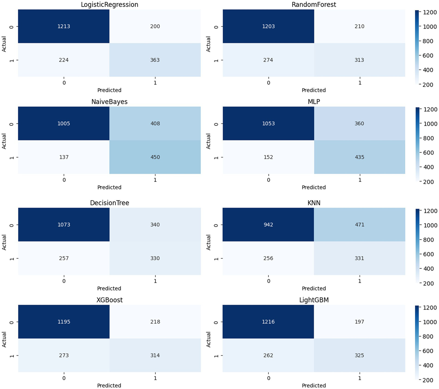 Eight confusion matrices for different algorithms: Logistic Regression, Random Forest, Naive Bayes, MLP, Decision Tree, KNN, XGBoost, and LightGBM. Each matrix shows true positives, true negatives, false positives, and false negatives, with a color gradient indicating frequency from dark to light blue.