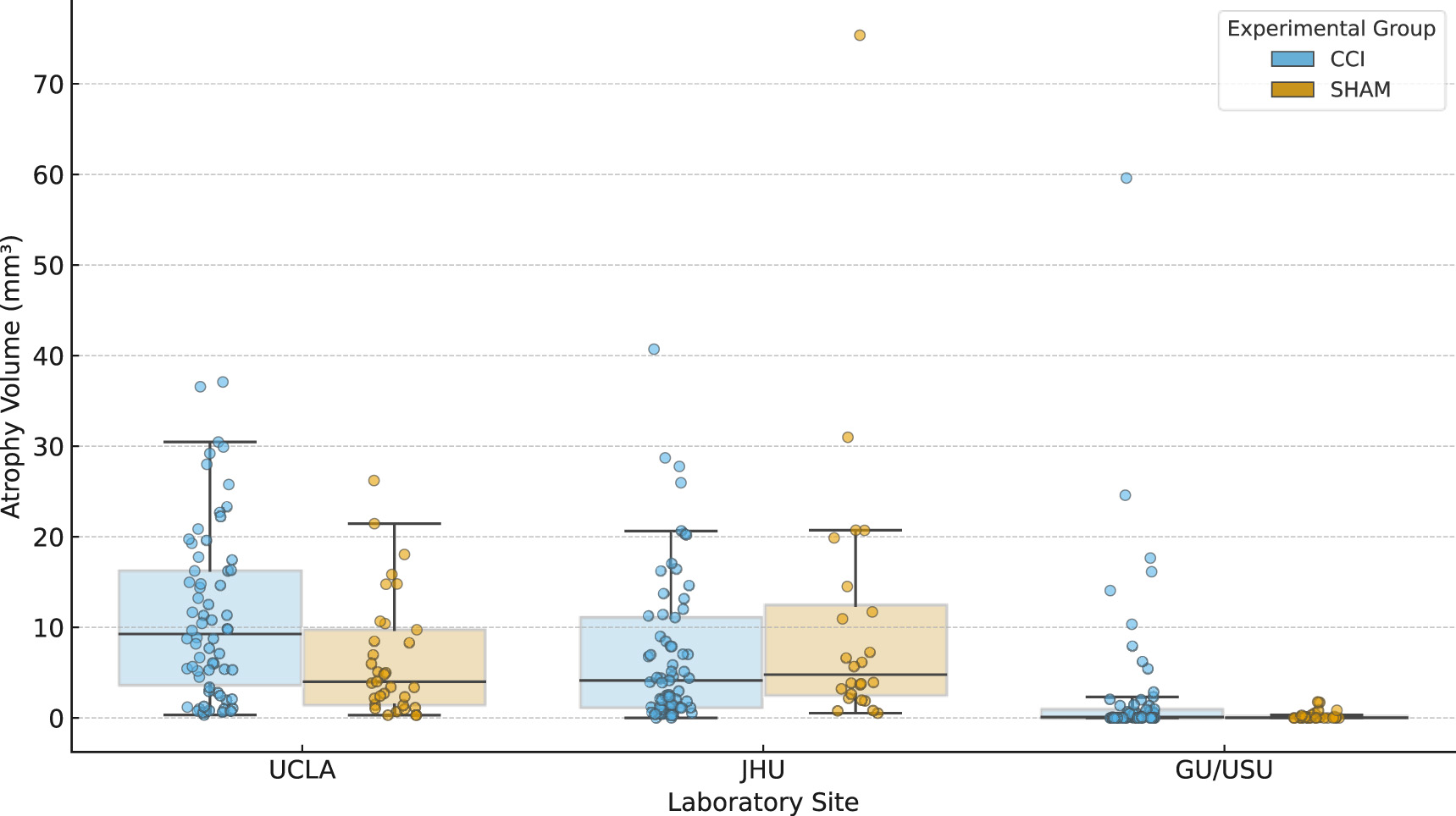 Figure 3 displays local tissue contraction data, referred to here as atrophy volume measurements for animals scanned at three of the four participating sites. Atrophy was defined as the total brain volume showing contraction at a Jacobian z-score threshold of less than −3.1. Measurements are grouped by acquisition site (UCLA, JHU, and GU/USU) and experimental group (CCI or SHAM). The data include both day 3 and day 30 post-injury scans and reflect deformation-based estimates of local tissue loss aligned to a harmonized multi-site template.