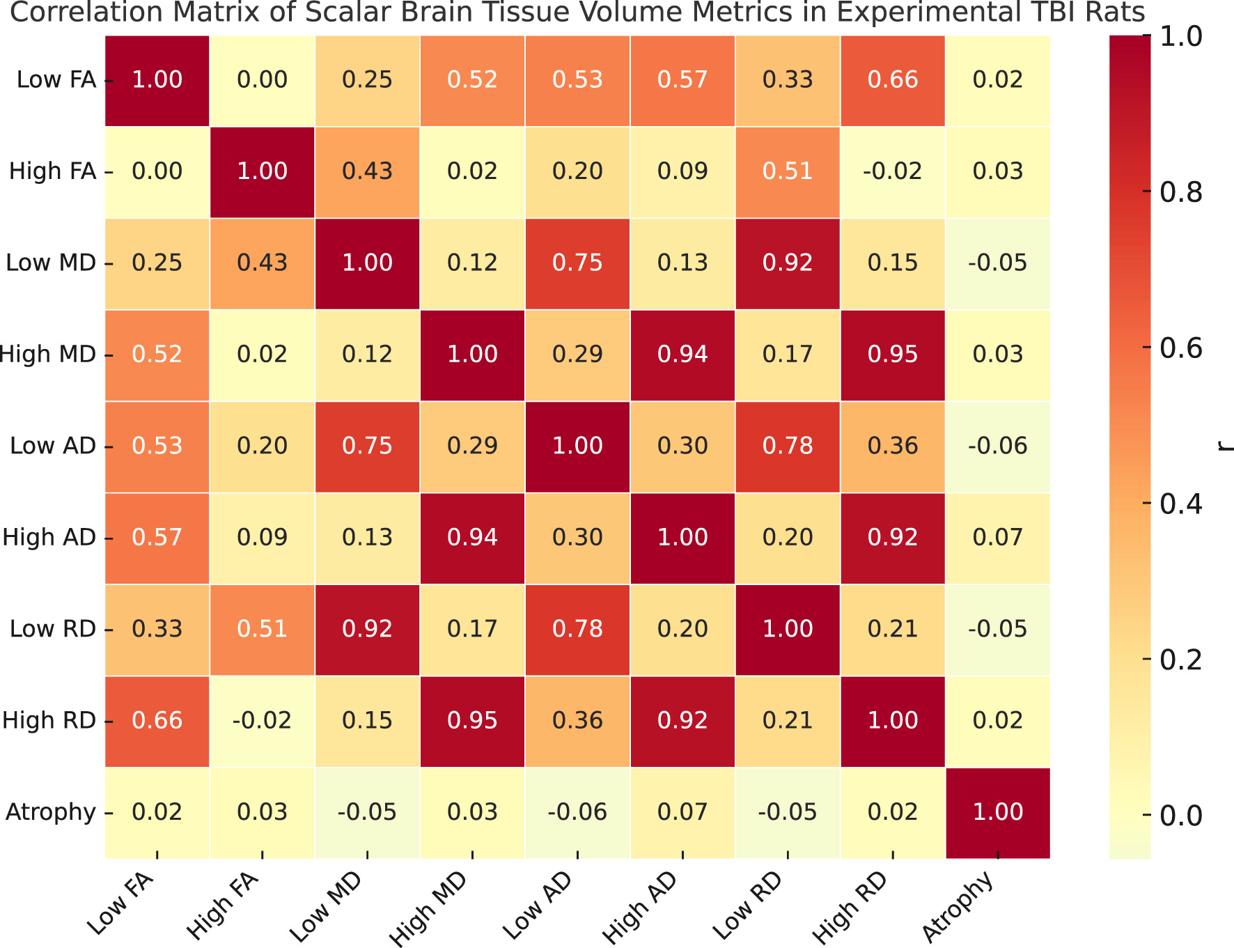 Correlation matrix of scalar brain tissue volume metrics (plotted on X and Y axis) in experimental TBI rats as a descriptive interpretation. Pairwise Pearson correlation coefficients are shown between nine scalar metrics derived from harmonized diffusion MRI data. The variables include low and high z-score volumes for fractional anisotropy (FA), mean diffusivity (MD), axial diffusivity (AD), and radial diffusivity (RD), along with total atrophy volume (Jacobian z < −3.1). Each entry in the matrix reflects the strength and direction of the linear relationship between two variables across the full dataset.