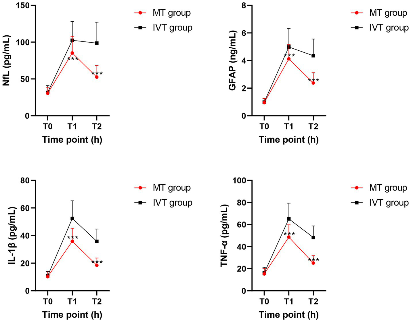 Within-group comparisons showed that serum NfL and GFAP concentrations in both groups peaked at 24 h post-procedure (T1), showing a significant increase compared to pre-treatment levels (T0) (all p < 0.01). By 72 h post-procedure (T2), concentrations of both biomarkers decreased significantly in the MT group (NfL: T1: 85.3 ± 22.1 pg/mL vs. T2: 52.6 ± 15.8 pg/mL; GFAP: T1: 4.12 ± 1.05 ng/mL vs. T2: 2.38 ± 0.74 ng/mL; p < 0.001), whereas the IVT group maintained near-peak levels (NfL at T2: 98.7 ± 28.4 pg/mL; GFAP at T2: 4.35 ± 1.21 ng/mL), with no significant difference from T1 (p > 0.05).