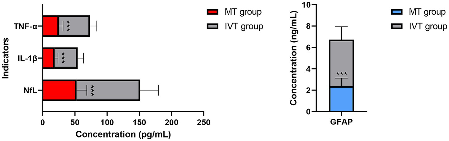 Distribution of serum biomarker levels at 72 h post-procedure (T2). Serum neurofilament light chain (NfL) levels. Serum glial fibrillary acidic protein (GFAP) levels. Concentrations are presented as box plots. Compared to the IVT group, the MT group showed significantly lower concentrations of both biomarkers (***p < 0.001).