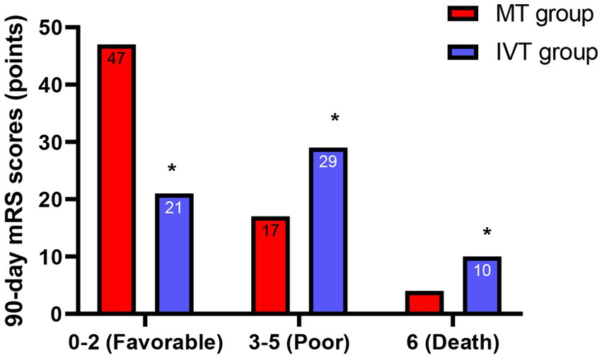 Functional outcomes at 90 days. Bar graph showing the proportion of patients achieving a favorable functional outcome (modified Rankin Scale score 0–2) at 90 days. The proportion was significantly higher in the MT group (69.1%) than in the IVT group (35.0%) (χ2 = 14.32, *p < 0.001).