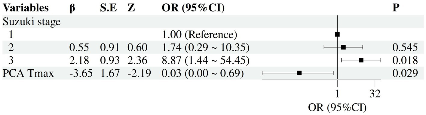 Univariable and multivariable logistic regression analyses were performed. According to univariable analysis, advanced Suzuki stage, moyamoya vessel density, thalamic Tmax, and PCA Tmax were significantly associated with postoperative CHS (p < 0.05) (Tables 1, 3). Variables with p < 0.05 were entered into multivariable logistic regression, and Stepwise selection was applied based on the Wald test. During the stepwise procedure, “moyamoya vessel density” had an overall Wald = 2.301, df = 2, p = 0.316, which was not significant. Specifically, “sparse” had B = −18.315, SE = 8571.253, Wald = 0, p = 0.998, indicating unstable estimation (complete separation). Therefore, this variable was removed. THAL Tmax had B = −0.982, SE = 1.867, Wald = 0.276, p = 0.599 in the initial model, not significant, and was also removed. Ultimately, the model retained the variables “Suzuki stage” and “PCA Tmax.” Multivariable analysis showed that advanced Suzuki staging (OR (95% CI), 8.87 (1.44–54.45), p = 0.018), and Tmax of PCA (OR (95% CI), 0.03 (0.00–0.69), p = 0.029) were statistically significantly associated with the occurrence of CHS (Figure 2).