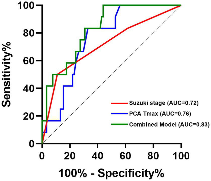 ROC analysis demonstrated that the multivariable logistic regression model combining Suzuki stage and PCA Tmax achieved an AUC of 0.83 (p < 0.000), (cut-off value = 0.060), indicating good discriminative performance for predicting postoperative CHS. In comparison, PCA Tmax alone showed moderate predictive ability, with an AUC of 0.76 (p = 0.003) (cut-off value = 1.055). Suzuki stage alone also demonstrated moderate predictive power, yielding an AUC of 0.72 (p = 0.015) (cut-off value = 2.5), indicating a significant increase in CHS risk at advanced Suzuki stages (Figure 3).