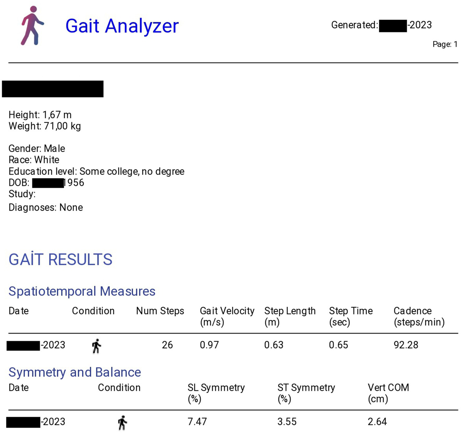 Gait analysis report sample, showing key metrics and visualizations from the analysis software.