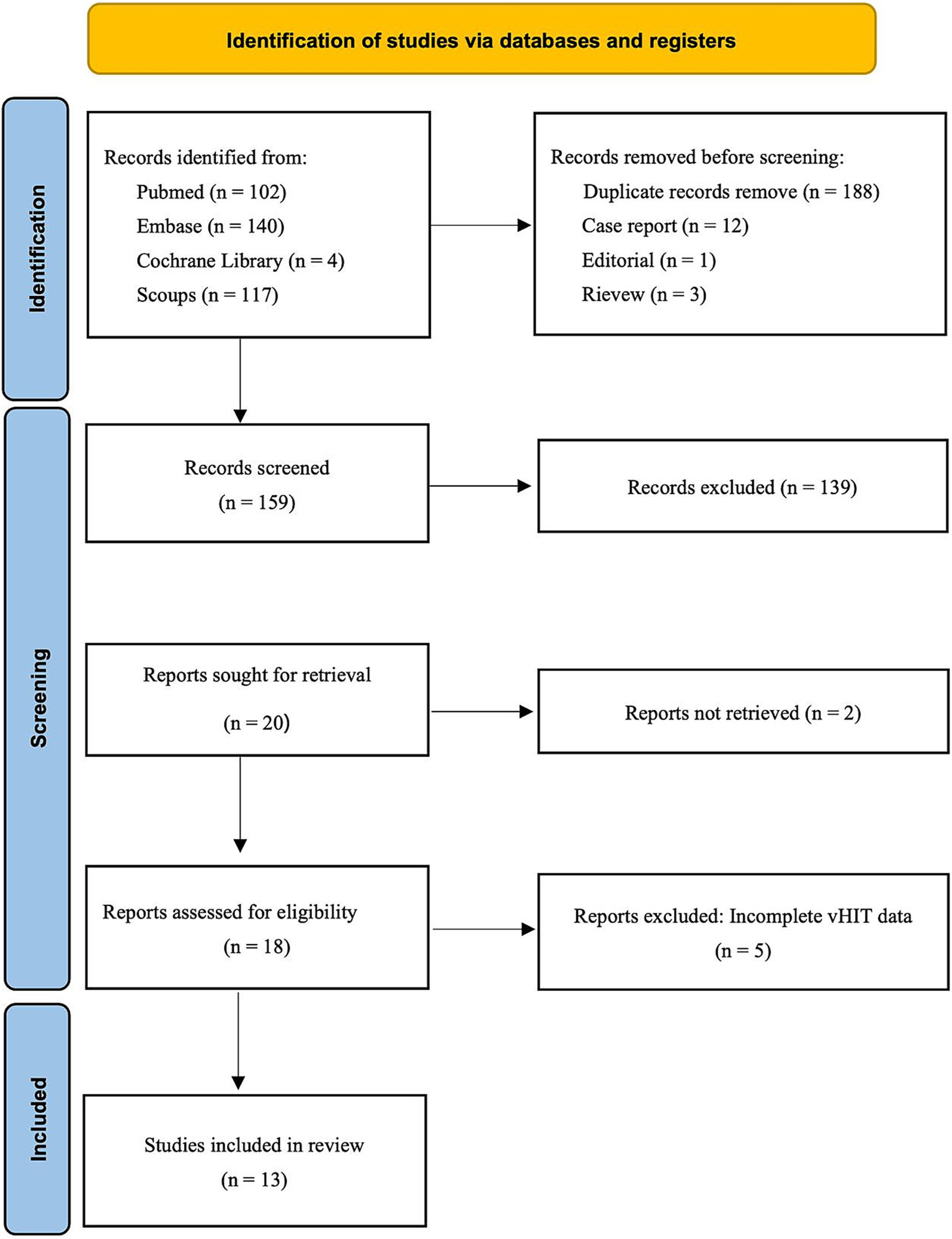 The PRISMA flowchart in Figure 1 illustrates the process of searching, deleting, and filtering for relevant studies. As of February 24, 2025, a total of 363 records were identified through searches using subject headings and free-text terms for “Hearing Loss, Sensorineural” and “video head impulse test”. Before abstract screening, 188 duplicate records were removed. Among the remaining records, 12 case reports, 3 review articles, and 1 editorial were excluded. After screening titles and abstracts, 139 records were further excluded. Two studies could not be retrieved in full text (13, 14), and five studies did not provide detailed vHIT parameter data (15–18). Ultimately, 13 studies were deemed eligible for inclusion (19–31).