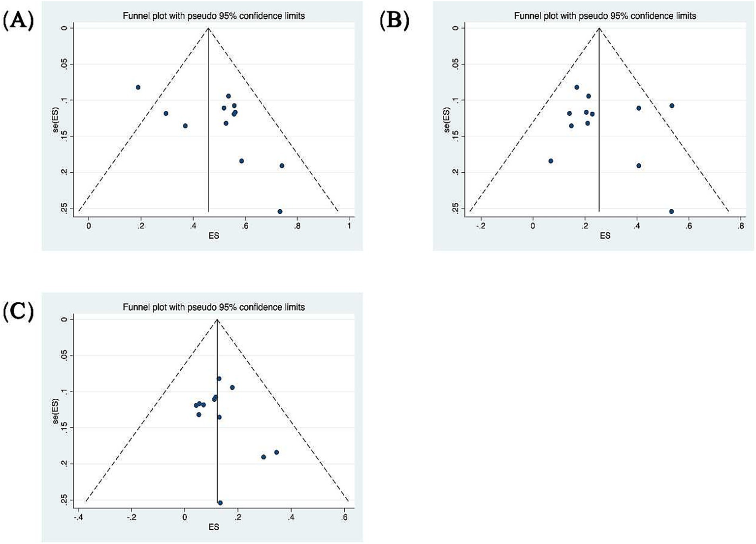 Funnel plots for the evaluation of publication bias. (A) Funnel plot of the included studies in the meta-analysis of the abnormality rate in PSCC. p = 0.373 > 0.05, funnel plot symmetry, no publication bias. (B) Funnel plot of the included studies in the meta-analysis of the abnormality rate in HSCC. p = 0.732 > 0.05, funnel plot symmetry, no publication bias. (C) Funnel plot of the included studies in the meta-analysis of the abnormality rate in ASCC. p = 0.945 > 0.05, funnel plot symmetry, no publication bias.