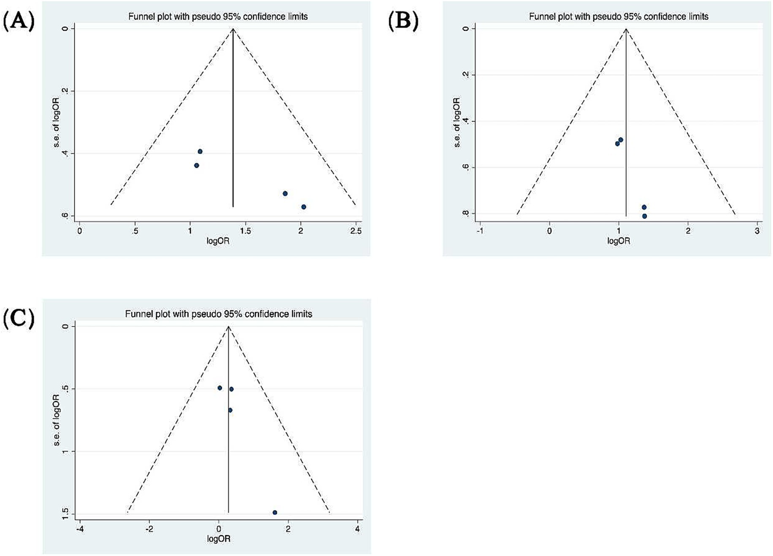 Funnel plots for the evaluation of publication bias. (A) Funnel plot of the included studies in the meta-analysis of hearing retrieval and PSCC. p = 0.045 > 0.05. (B) Funnel plot of the included studies in the meta-analysis of hearing retrieval and HSCC. p = 0.017 < 0.05. (C) Funnel plot of the included studies in the meta-analysis of hearing retrieval and ASCC. p = 0.111 > 0.05.