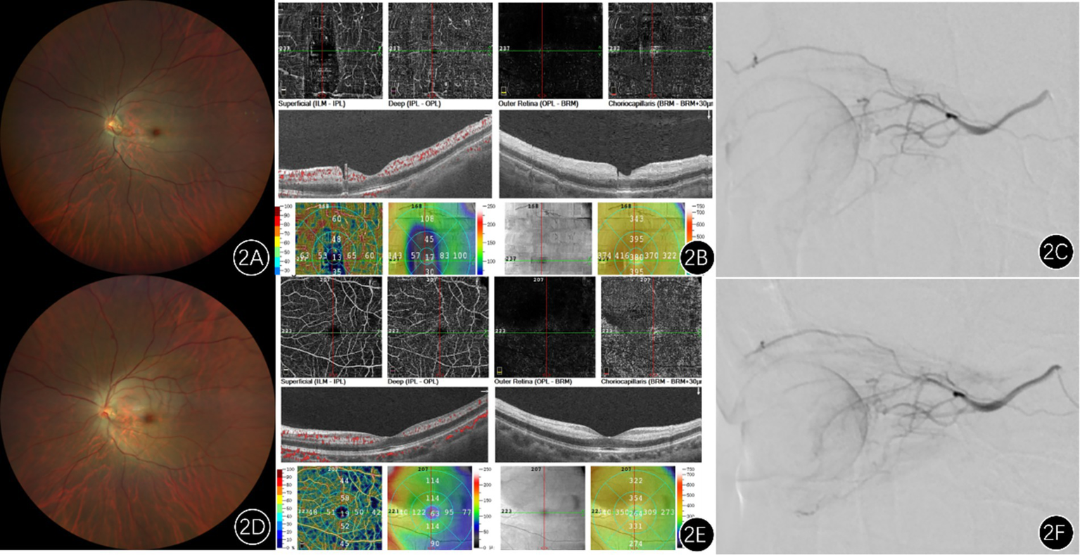 All procedures were performed under local anesthesia. The femoral artery was punctured using the modified Seldinger technique, and a 5F vascular sheath was introduced. A 5F guiding catheter was navigated sequentially through the common femoral, iliac, and aortic arteries into the common carotid and subsequently the internal carotid artery (ICA). Cerebral angiography via the ICA was performed to confirm ophthalmic artery patency and identify its origin. A microguidewire and microcatheter were then used to superselect the ophthalmic artery. Follow-up angiography confirmed the occlusion site within the ophthalmic artery or its branches. Subsequently, 400,000 IU of urokinase followed by 30āÆmg of papaverine were slowly injected through the microcatheter. To minimize the risk of vasospasm and ischemia, the microcatheter dwell time within the ophthalmic artery was kept under 5āÆmin. Angiography was repeated 30āÆmin post-injection to assess reperfusion.