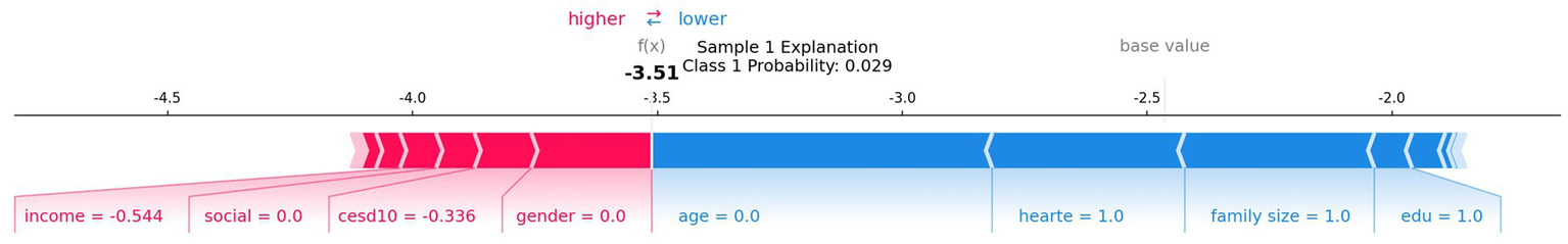 SHAP analysis identified family size, age, education, sex, income, and CES-D score as the most important predictors (Figure 4). At the individual level, a representative SHAP force plot (Figure 5) shows how protective factors (e.g., larger family size, higher education) can offset unfavorable factors (e.g., lower income, limited social participation), resulting in a lower predicted risk. We offer only descriptive interpretations and make no causal claims.