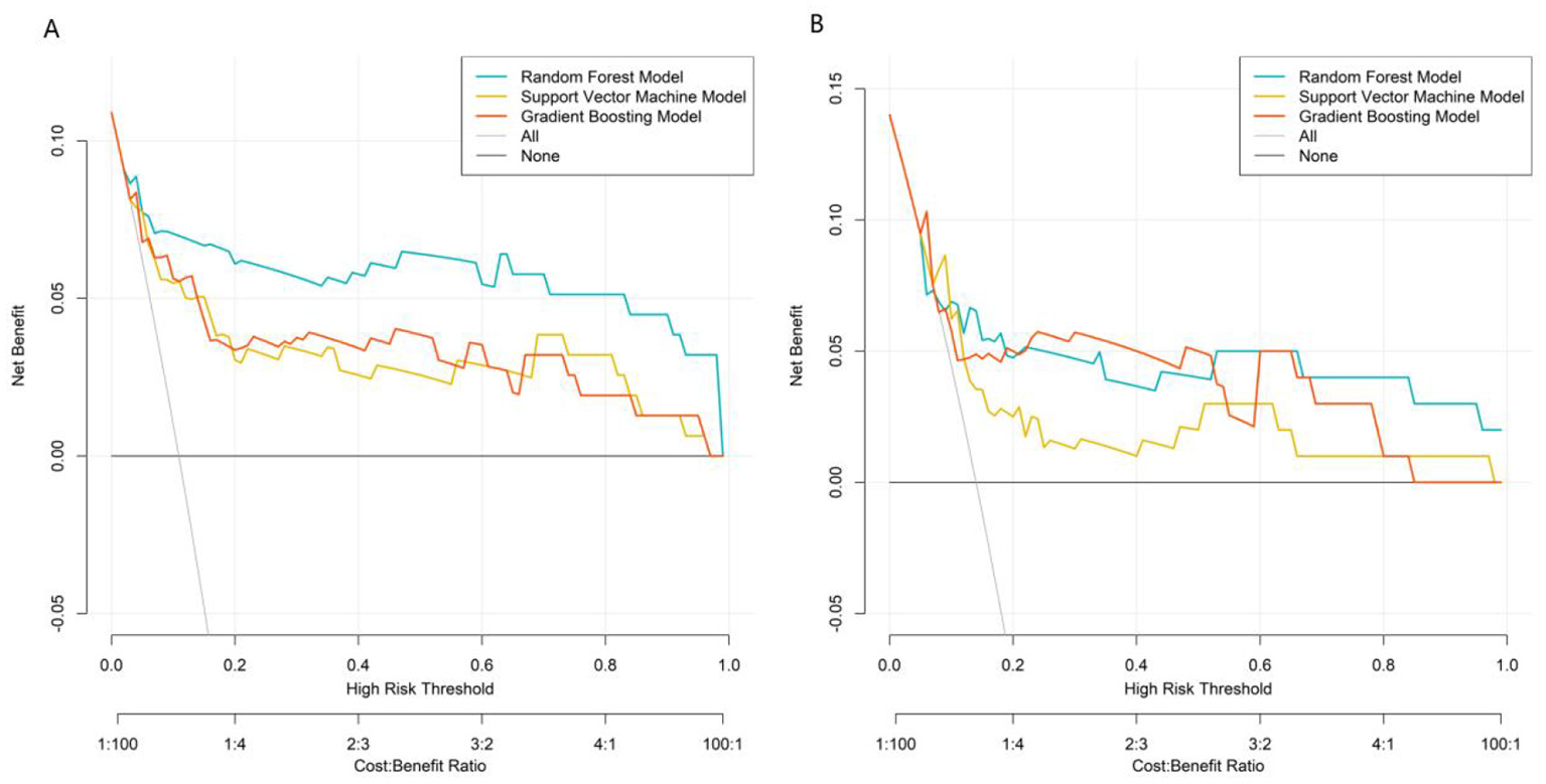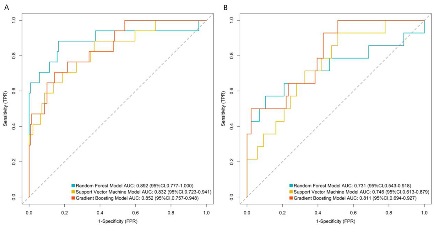 In the training set (Figure 2A), the RF model achieved an AUC of 0.892 (95% CI: 0.777–1.000), the SVM model 0.832 (95% CI: 0.723–0.941), and the GB model 0.852 (95% CI: 0.757–0.948). In the validation set (Figure 2B), the RF model had an AUC of 0.731 (95% CI: 0.543–0.918), the SVM model 0.746 (95% CI: 0.613–0.879), and the GB model 0.811 (95% CI: 0.694–0.927).
