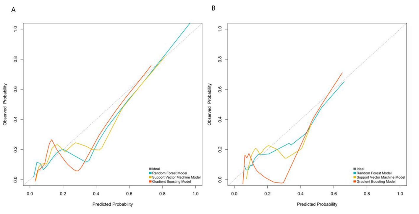 In both the training and validation sets, model calibration was evaluated. The RF model's curve was visually closer to the ideal 45° line (representing perfect prediction) than those of the SVM and GB models: in the validation set, the predicted PSE probabilities of the RF model deviated by < 5% from the observed event rates across all risk quantiles (Figure 3). To further quantify calibration performance, we supplemented the Brier score for all three models: RF = 0.067, SVM = 0.083, and GB = 0.075. Brier scores range from 0 to 0.25, with lower values indicating better calibration accuracy. The RF model's lowest Brier score confirms its predicted probabilities are the most consistent with actual observed PSE event rates compared to the other two models. This quantitative result aligns with the visual observation of calibration curves, providing dual support for the RF model's reliable calibration performance.