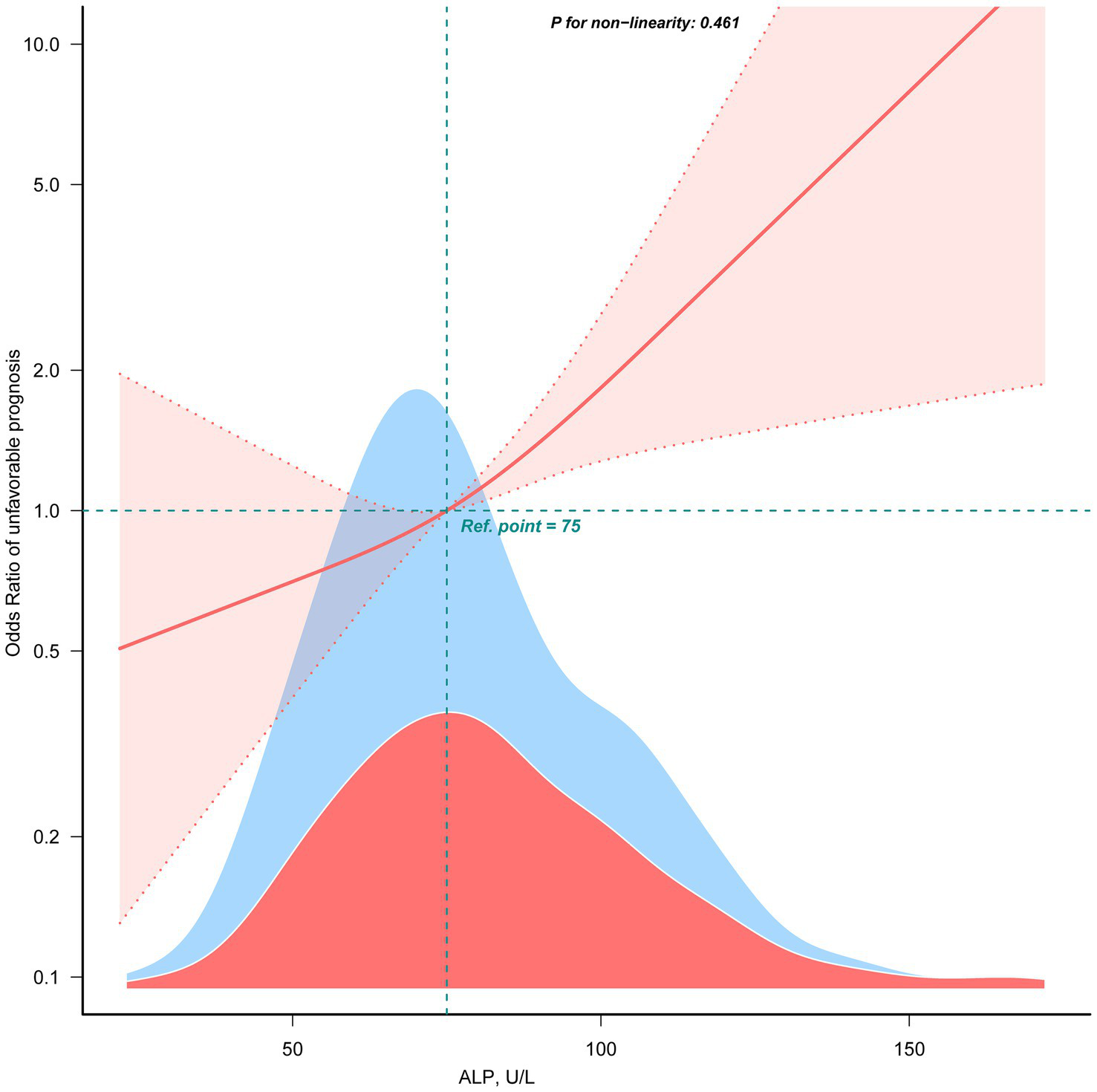 The linear association between ALP and unfavorable prognosis. Data were fit by a multivariable logistic regression model based on restricted cubic spline. Data were adjusted for sex, age, AF, baseline NIHSS, baseline ASPECTS, occlusion site, collateral status, OPT, procedure time, mTICI, first-line treatment, maneuvers, any ICH, eGFR, EH, DM, IV thrombolysis, ALT, AST, and WBC (Model 3). Here the median ALP was defined as the reference standard. Solid and dashed lines indicate the predicted value and 95% CI. Only 99% of the data is shown.