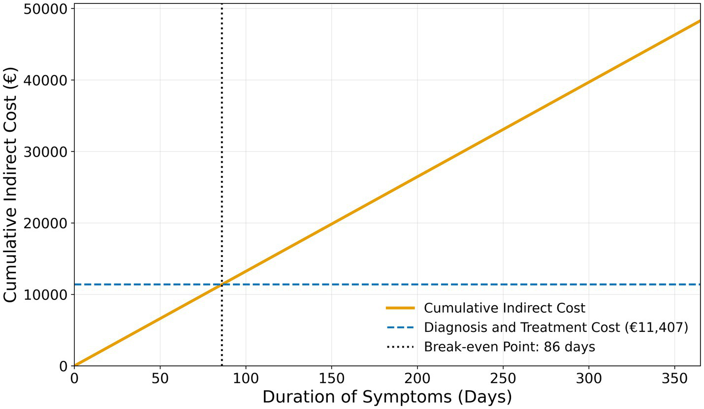The economic model in Figure 4 illustrates the long-term burden of SIH for a single patient with the cohort’s median age of 45.5 years and persistent incapacity to work. Assuming continued work-incapacity over 10 years, indirect costs accumulated to €337,874, and to €669,383 until the current statutory retirement age in Germany at 67 years (21.5 years from the median age). Figure 5 shows that indirect costs increased almost linearly with the duration of undiagnosed and untreated SIH, making early intervention more cost-effective from a societal perspective. Indirect costs exceeded the average direct medical costs of €11,407 after approximately 86 days, marking a purely economic break-even point. Sensitivity analysis varying the indirect costs by ±20% demonstrated that prolonged illness duration was the dominant driver of total costs (Table 3). Across all scenarios, early definitive treatment within 90 days resulted in substantially lower total costs (€21,376–€26,360) compared to the cohort median duration (160 days; €28,342–€36,809) and prolonged cases (360 days; €48,245–€66,664), underscoring the robust economic benefit of timely intervention.