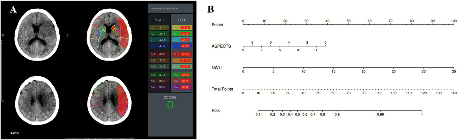 This retrospective study investigated AIS patients with large vessel occlusion who achieved successful recanalization from January 2022 to November 2024. Baseline ASPECTS-NWU was automatically quantified from the admission CT. The primary outcome was FR, defined as a modified Rankin Scale (mRS) score of 3–6 at 90 days following successful recanalization (modified Thrombolysis in Cerebral Infarction score, 2b/3). Intergroup comparisons of clinical and neuroimaging parameters were performed using the Mann–Whitney U test for continuous variables and the χ2 test for categorical measures. Bivariate correlations between NWU values and other covariates were assessed using Spearman’s rho coefficients. Multivariable logistic regression identified independent predictors of FR, and a subsequent nomogram was constructed. The logistic regression model was tested using the 5-fold cross-validation. The predictive accuracy of different models was evaluated using the receiver operating characteristic curve and DeLong’s test.
