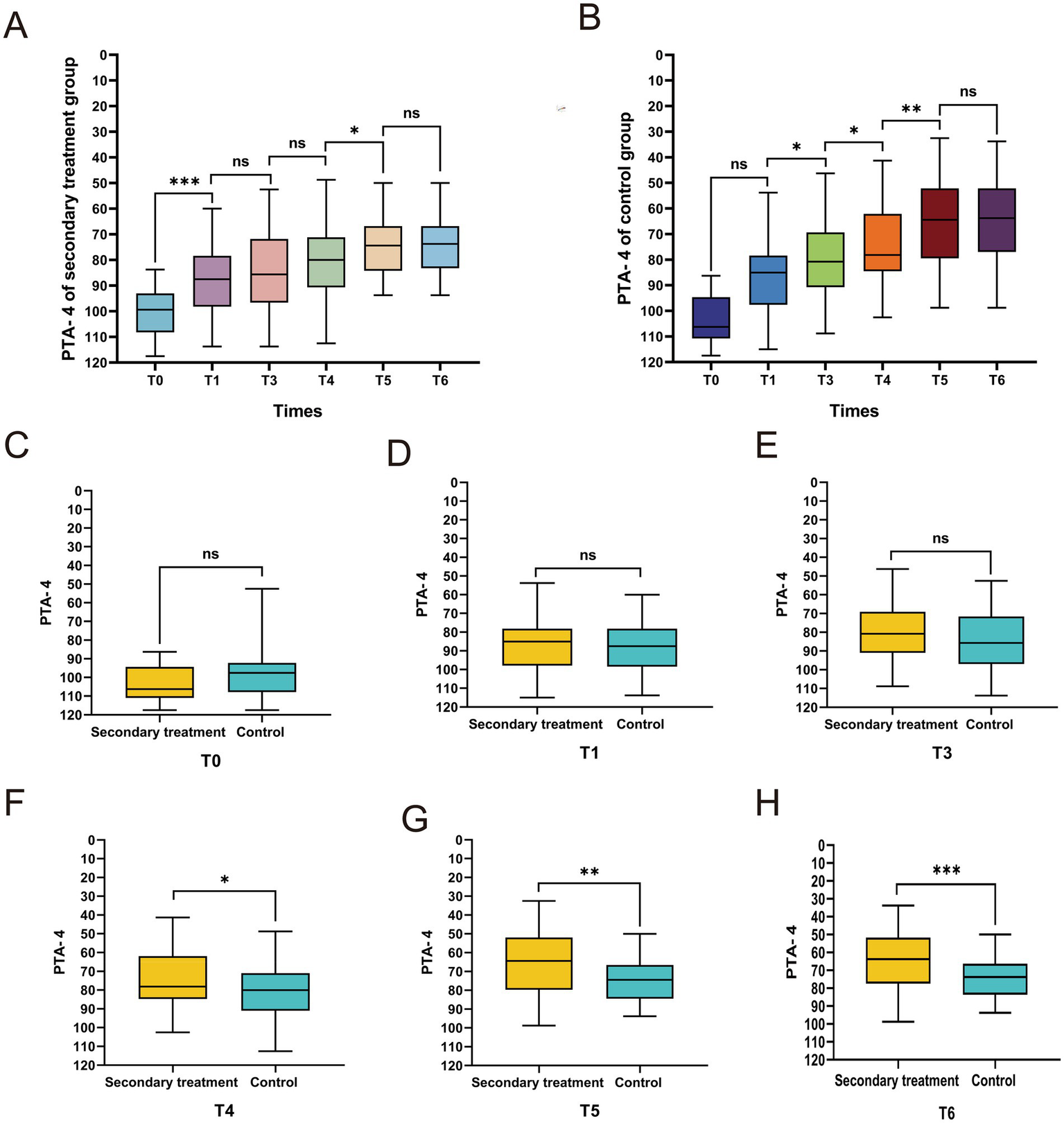 Comparison of average hearing thresholds at different time points. (A–D) Serial measurement results of the mean hearing thresholds at low, middle, high, and full-frequency ranges in the secondary treatment group. (E–H) Corresponding threshold measurement data of the control group.