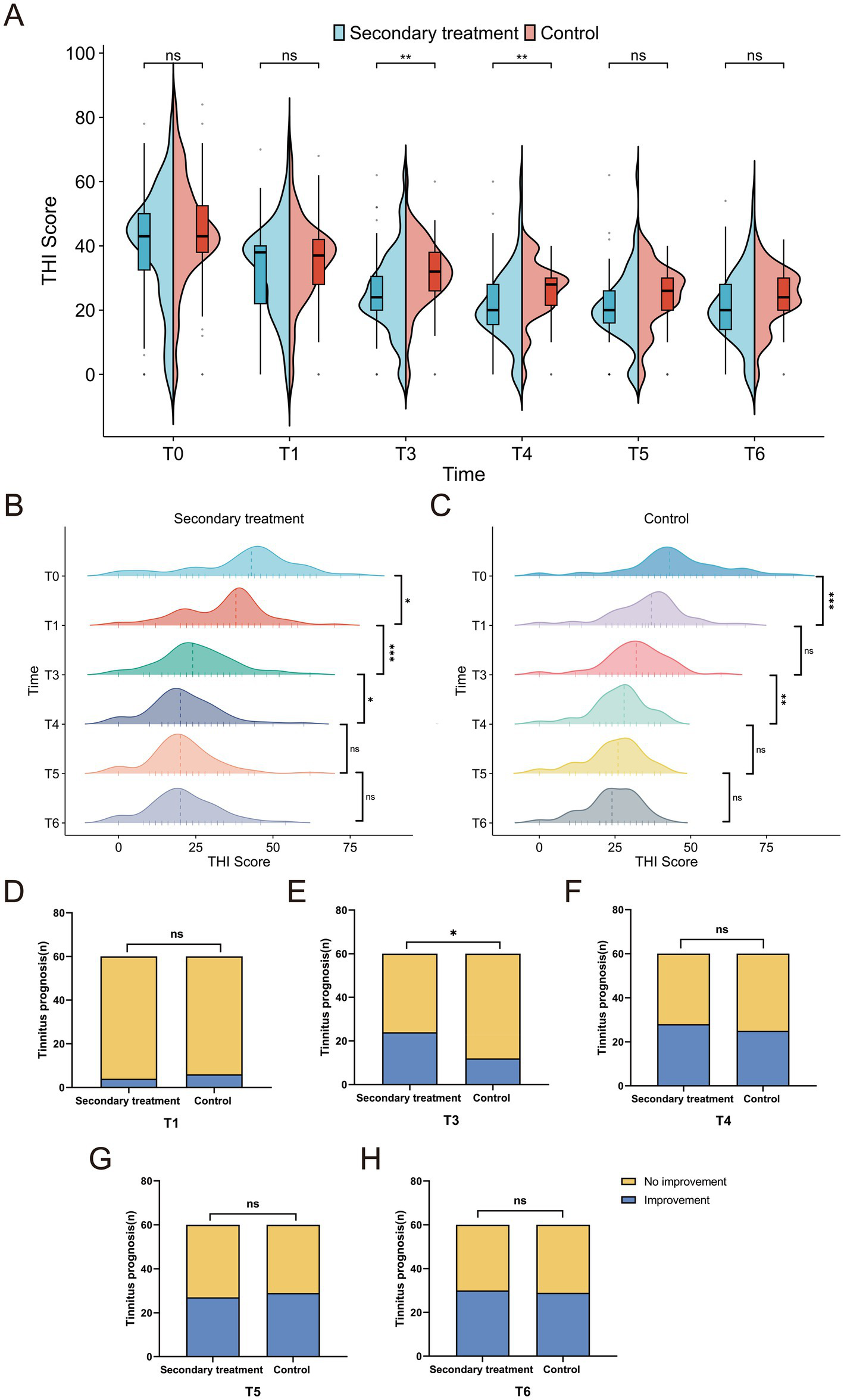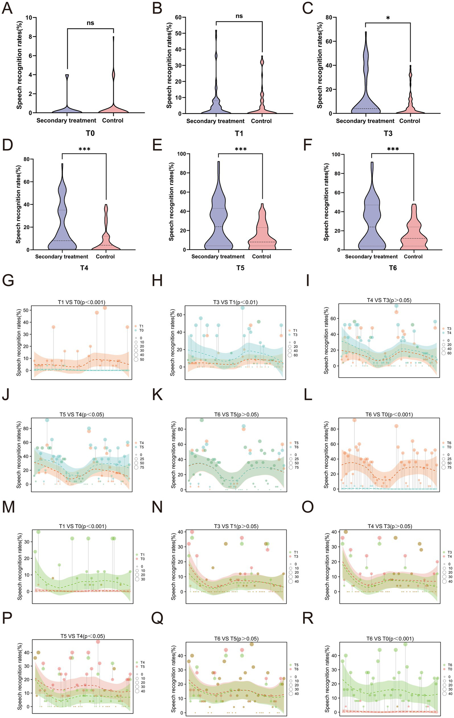 Within-group comparisons were conducted for changes in low-, middle-, high-, and overall-frequency hearing thresholds, monosyllabic word recognition rate, and tinnitus between successive time points: T1 vs. T0, T2 vs. T1 (secondary group only), T3 vs. T1, T4 vs. T3, T5 vs. T4, and T6 vs. T5, to assess dynamic treatment responses over time.