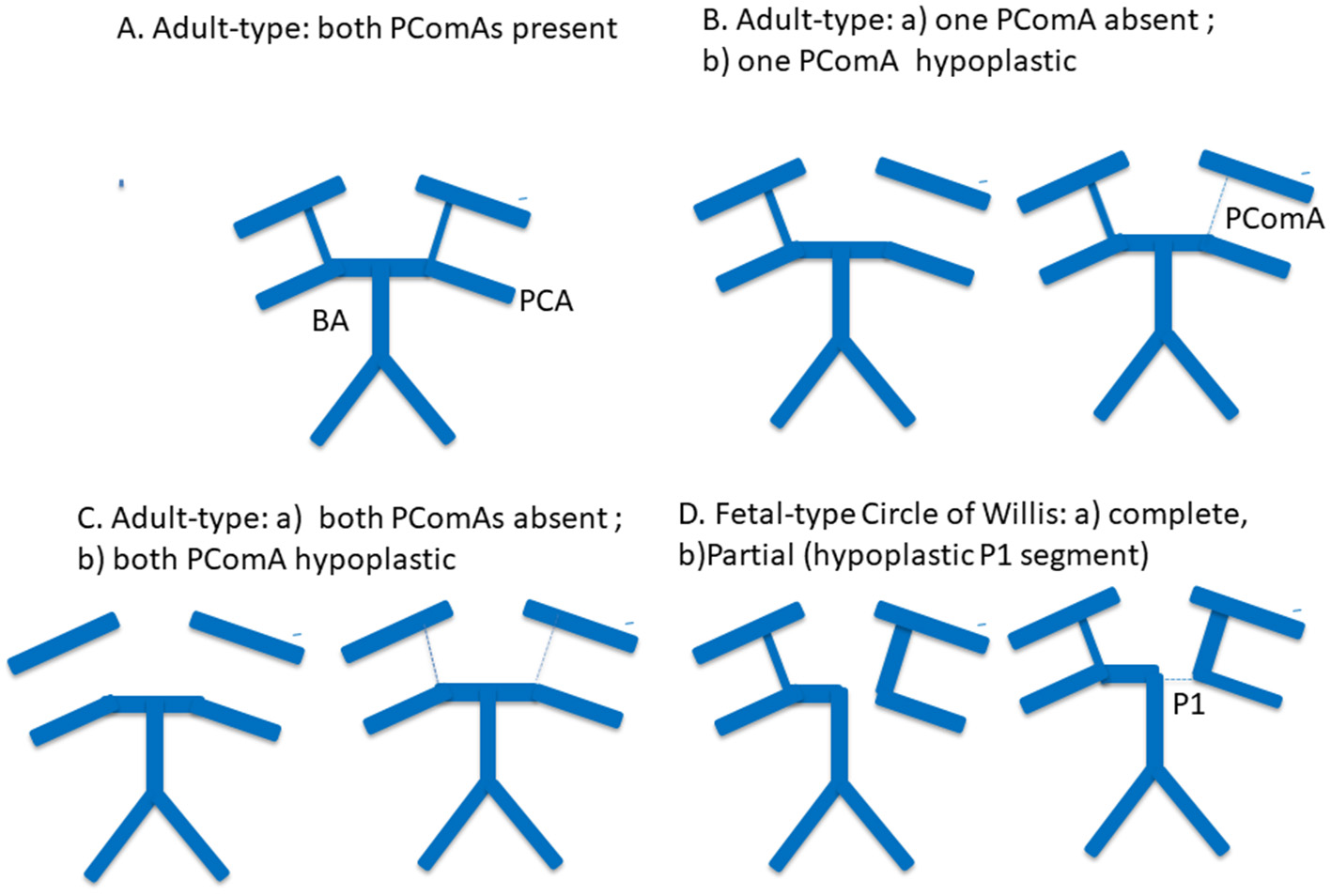 Schematic representation of posterior Circle of Willis configurations included in the analysis. Representative posterior Circle of Willis variants are shown, including a complete adult-type configuration, absence or hypoplasia of one posterior communicating artery (PComA), absence or hypoplasia of both PComAs, and fetal-type Circle of Willis configuration. Solid thick lines indicate normally developed arterial segments, thin or dashed lines indicate hypoplastic segments, and absent segments represent arterial aplasia. PComA, posterior communicating artery; P1, P1 segment of the posterior cerebral artery; PCA, posterior cerebral artery; BA, basilar artery.