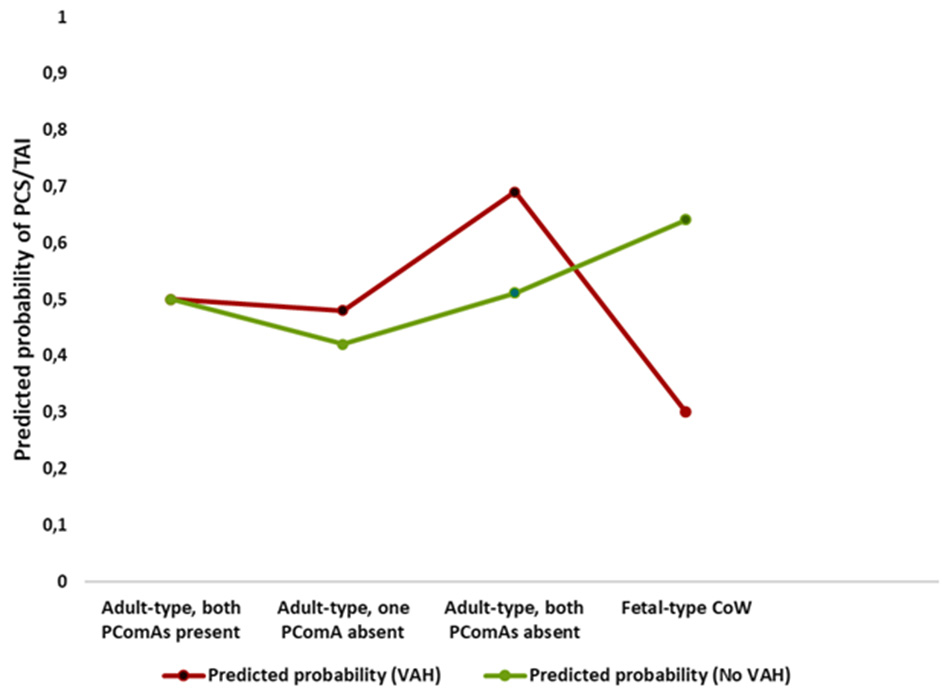 Interaction between posterior Circle of Willis configuration and vertebral artery hypoplasia on predicted probability of posterior circulation stroke or transient ischemic attack. Predicted probabilities of posterior circulation stroke or transient ischemic attack across posterior Circle of Willis configurations, stratified by vertebral artery hypoplasia (VAH), demonstrating opposite risk patterns for fetal-type Circle of Willis in participants with and without VAH.