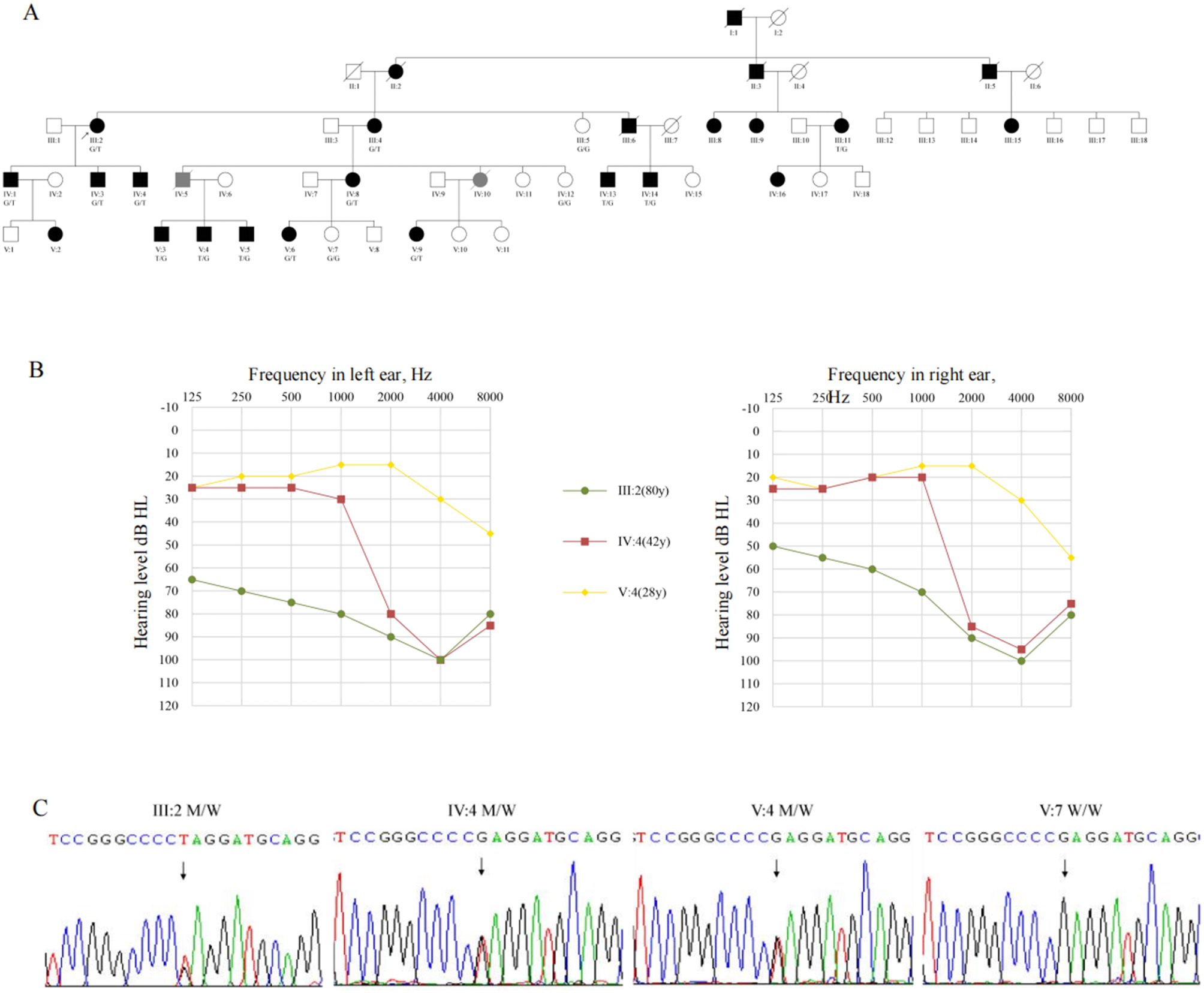 , Proband; T, Mutation allele; G, Wild-type allele. (B) The pure tone audiometry of III:2, IV-4, V-4. (C) Sanger sequencing of III:2, IV-4, V-4, V-7. T, Mutation allele; G, Wild-type allele.
