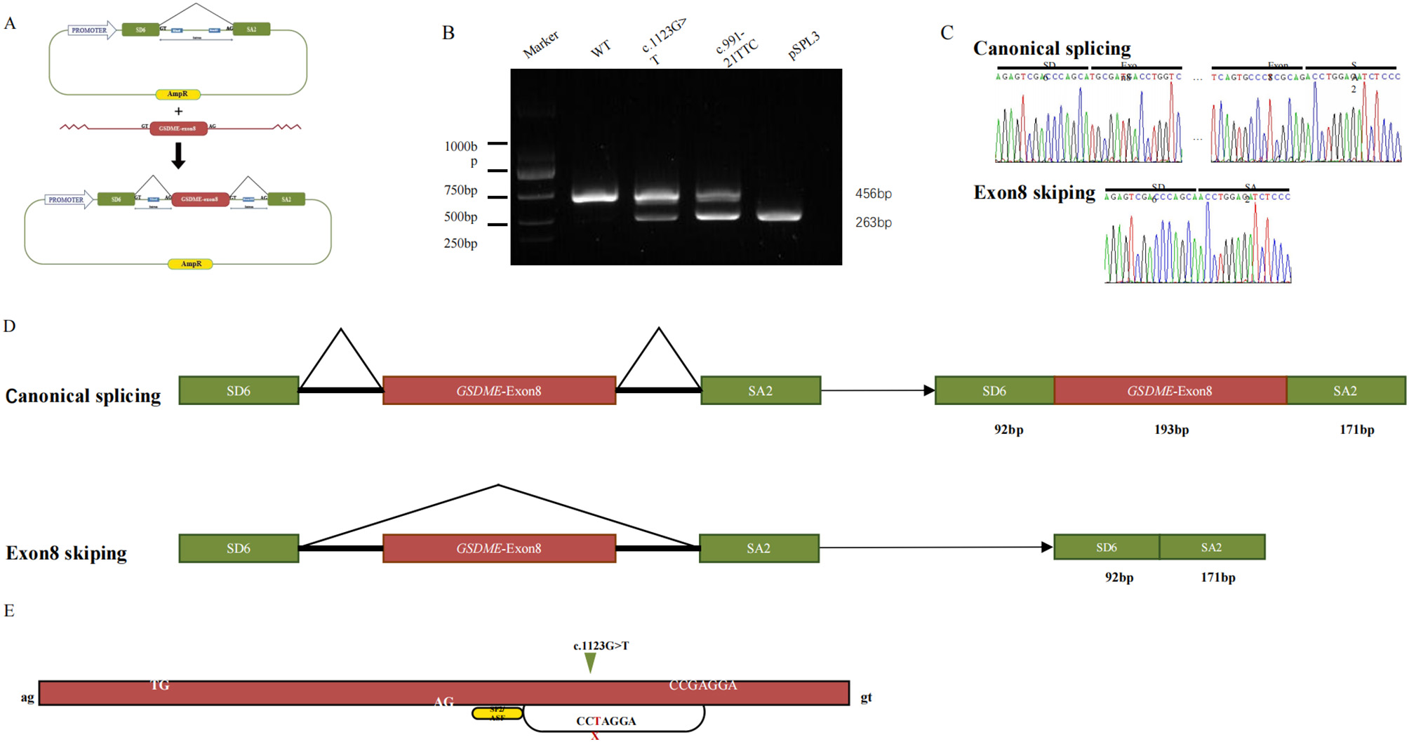 The pSPL3 vector, pre-purchased by our research group, was utilized to construct plasmids for in vitro splicing validation. This vector has 6031 base pairs and comprises an SV40 promoter, as well as two exons, SD6 and SA2. Specific primers with XhoI and BamHI restriction enzyme sites (F5′-CCCTCGAGCCGTCAGTGAAATGTAGCC3′ and R5′-CGGGATCCTTCCACAGTTACCACCTCTG3′) were utilized to amplify a 471 bp fragment that encompasses exon 8 of GSDME. The PCR products and plasmid underwent digestion with XhoI (Takara, 1094S) and BamHI (Takara, 1010S) restriction enzymes, respectively. Subsequently, T4 ligase (Takara, 2011A) was used for ligation. The ligated products were then transformed into E.coli DH5α Competent Cells (Takara, 9057) for amplification. Finally, single colonies were selected for sequencing to confirm the accuracy of the mutation.