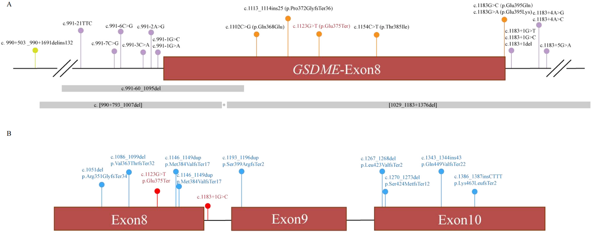 (A) Novel (red) and previously described (black) variants alignment to GSDME exon 8 and its flanking introns. Orange, variants in exon; purple, variants in splice region; green, variants in intron; gray, CNV; (B) LOF variants in GDC. Red, pathogenic variants; blue, begin variants.