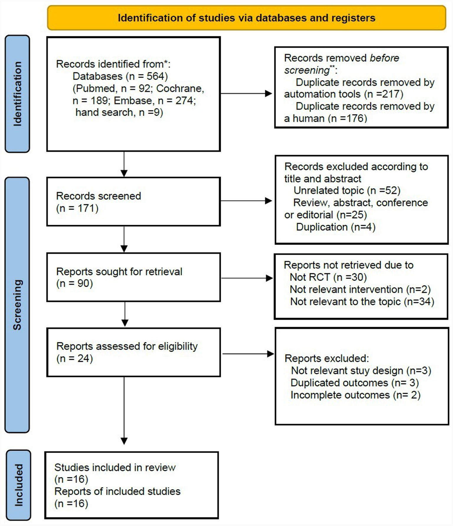 A total of 564 records were identified through database searches (PubMed/Medline, n = 92; Cochrane Library, n = 189; and Embase, n = 274) and additional manual search (n = 9). After removing duplicates using automated tools (n = 217) and performing manual review (n = 176), 171 records remained. Of these, 81 records were excluded based on the title and abstract review. The remaining 90 studies were reviewed, of which 73 were excluded for the following reasons: non-randomized controlled trials (RCTs) (n = 30) or unrelated to the interventions or target conditions (n = 36). Twenty-four studies underwent full-text reviews. Of these, seven were excluded due to inappropriate study designs (n = 3), duplicated reports (n = 3), or incomplete outcome data (n = 2). Finally, sixteen studies were deemed eligible for qualitative and quantitative synthesis (Figure 1).