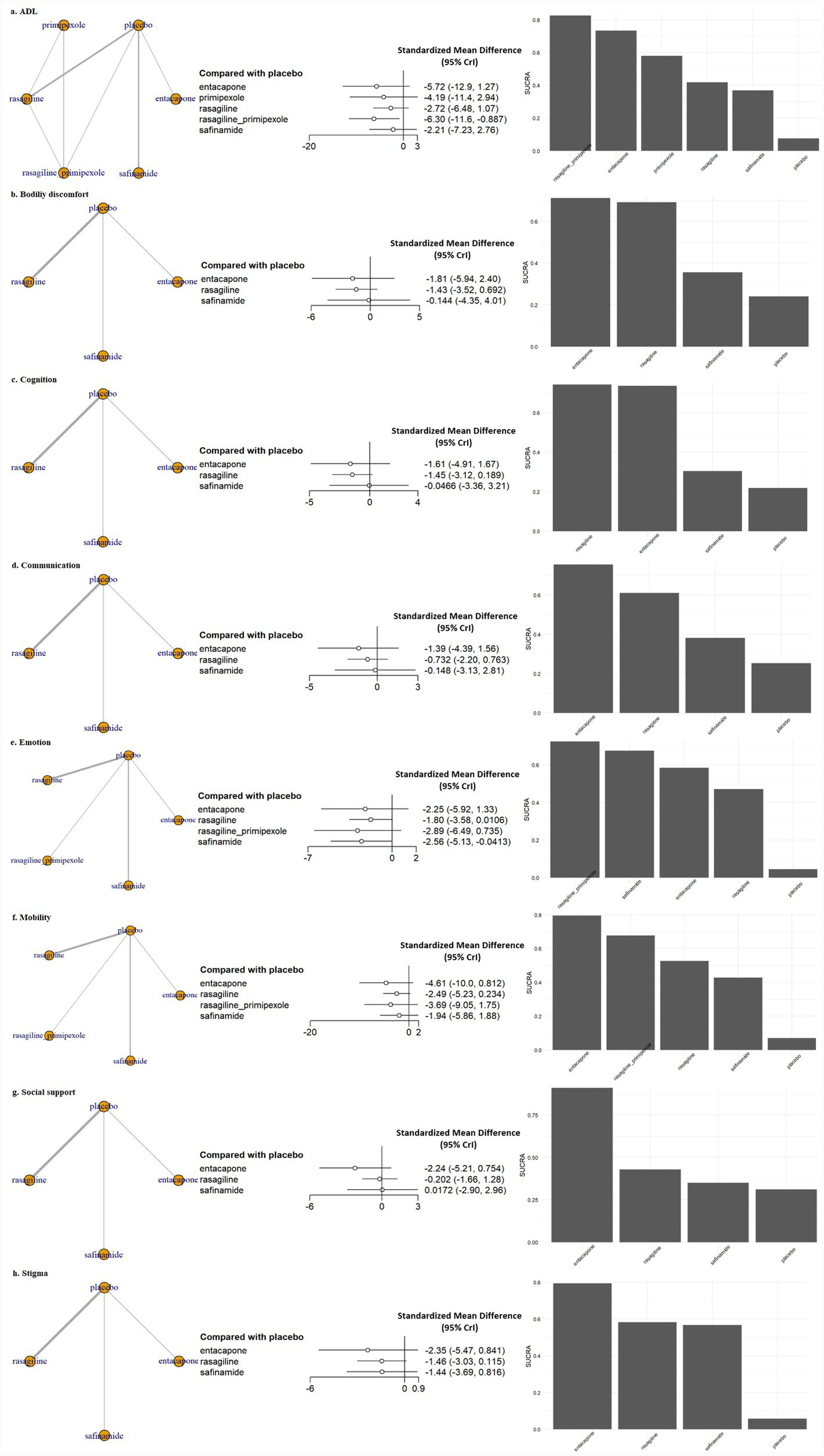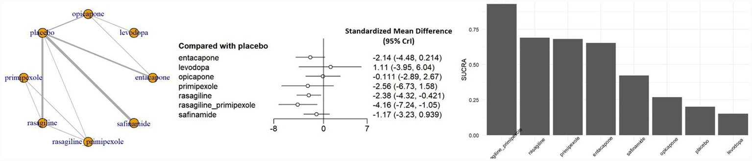 Sixteen RCTs comprised of 3,802 patients were included. The combination of extended-release rasagiline and pramipexole (P2B001) showed the most significant improvement in global QoL (SMD = −4.16; 95% CrI: −7.24 to −1.05), followed by rasagiline monotherapy (SMD = −2.38; 95% CrI: −4.32 to −0.42). Safinamide 100 mg significantly improved emotional well-being (SMD = −2.56; 95% CrI: −5.13 to −0.04). SUCRA rankings confirmed the superior probability of benefits for rasagiline-based interventions across multiple QoL dimensions.