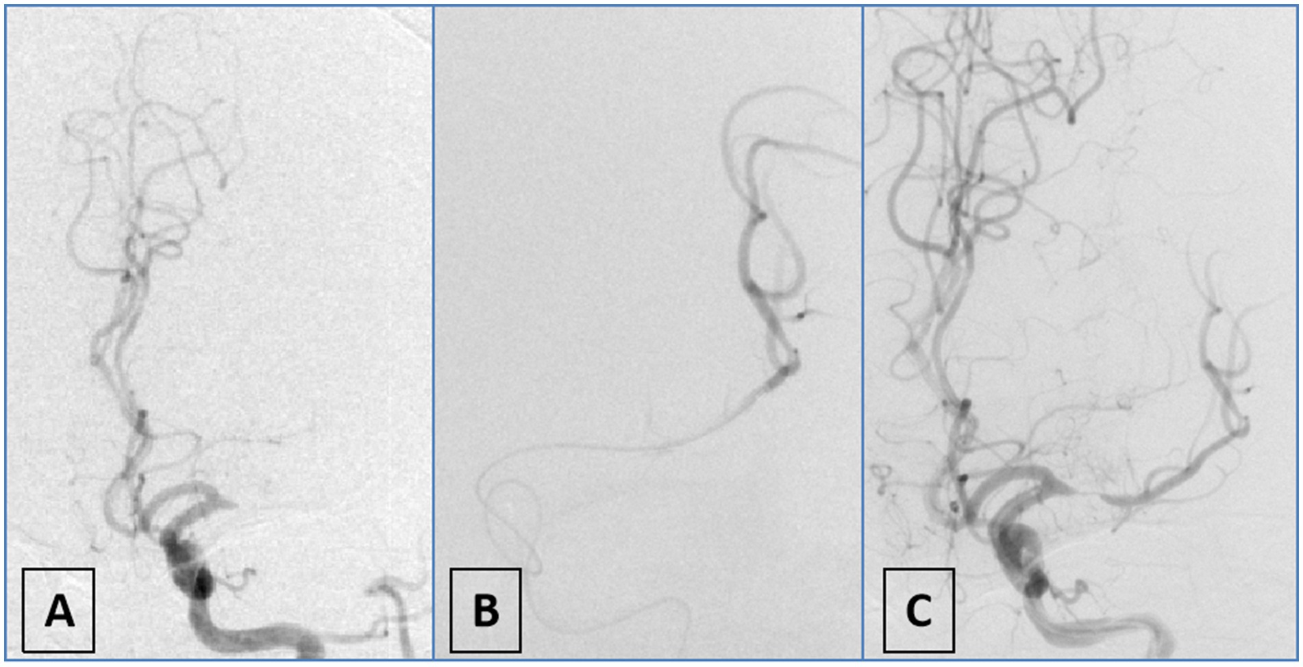 Figure 1. Schematic diagram of first-pass effect positivity. (A) DSA angiography demonstrates occlusion of the M1 segment of the left middle cerebral artery; (B) the microwire and microcatheter traverse the lesion to reach the distal vasculature, confirming intraluminal positioning; (C) repeat angiography after partial withdrawal of the microcatheter reveals severe stenosis in the M1 segment of the left middle cerebral artery.
