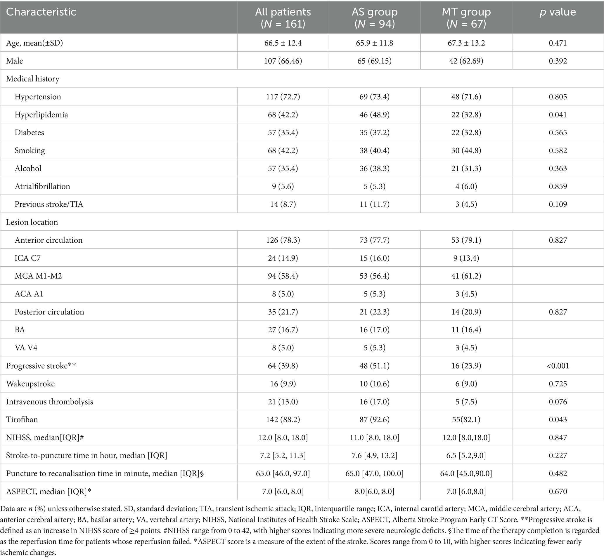 Patients were included if they were ≥ 18 years of age, had no evidence of intracranial hemorrhage on baseline non-contrast CT or MRI, and had an intracranial LVO confirmed by CTA, MRA, or DSA. Occlusions of the vertebral artery V4 segment were included only in the presence of contralateral vertebral artery hypoplasia or occlusion. The underlying etiology of ICAD-LVO was determined using a positive microcatheter first-pass effect (15) (Figure 1). Additional inclusion criteria consisted of a baseline National Institutes of Health Stroke Scale [NIHSS] score ≥6, indicating moderate to severe deficits, and an onset-to-puncture time within 24 h. Key exclusion criteria covered procedural termination before implementation of the initial approach, pre-stroke functional dependence (defined as mRS > 1), and the presence of ≥70% stenosis or occlusion proximal to the occluded vessel suggestive of an artery-to-artery embolism mechanism. We also excluded patients with refractory hypertension (>185/110 mmHg despite medication), severe dysglycemia (blood glucose <2.7 or >22.2 mmol/L), coagulopathy (platelet count <40 × 109/L, aPTT >50 s, or INR > 3), and those with incomplete clinical or angiographic data. These criteria were applied to minimize confounding related to comorbidities, technical variability, and data reliability issues. The final analysis included 161 patients with ICAD-LVO, who were classified into two groups according to the initial endovascular strategy: the AS group and the MT group (Figure 2).