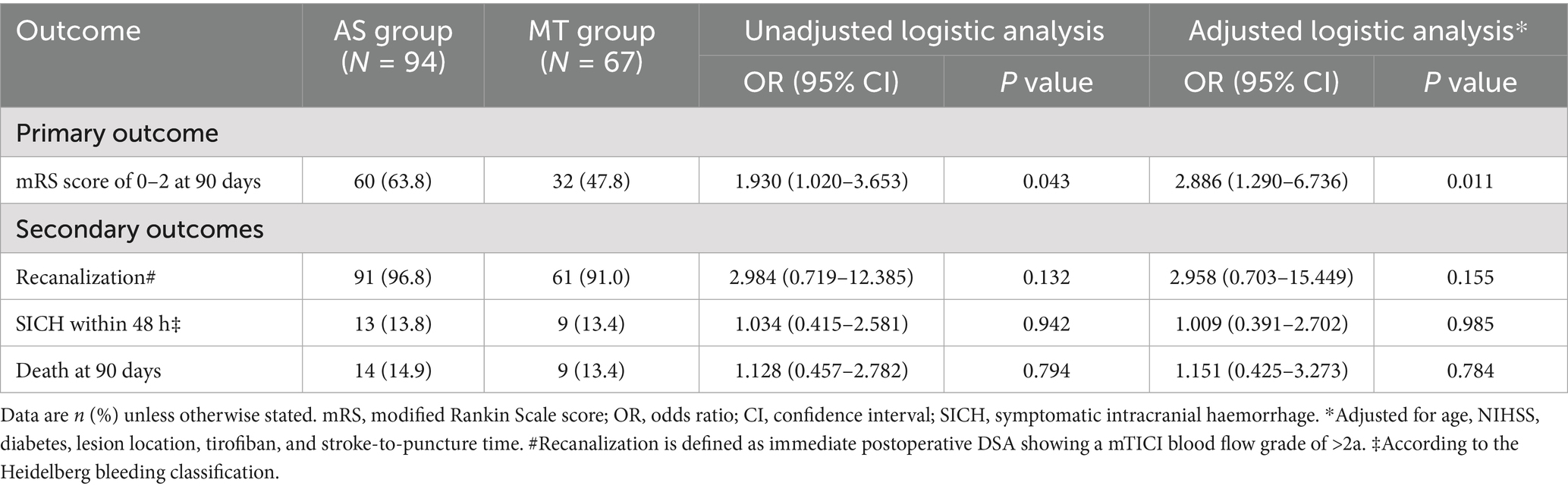 No statistically significant differences were observed across secondary outcomes between the AS and MT groups. Recanalization rates were comparable (96.8% vs. 91.0%, p = 0.132), with no association identified after adjustment (adjusted OR = 2.958, 95% CI: 0.703–15.449, p = 0.155). Similarly, SICH within 48 h (13.8% vs. 13.4%, p = 0.942) and all-cause mortality at 90 days (14.9% vs. 13.4%, p = 0.794) remained comparable between groups, with adjusted OR of 1.009 (95% CI: 0.391–2.702, p = 0.985) and 1.151 (95% CI: 0.425–3.273, p = 0.784).