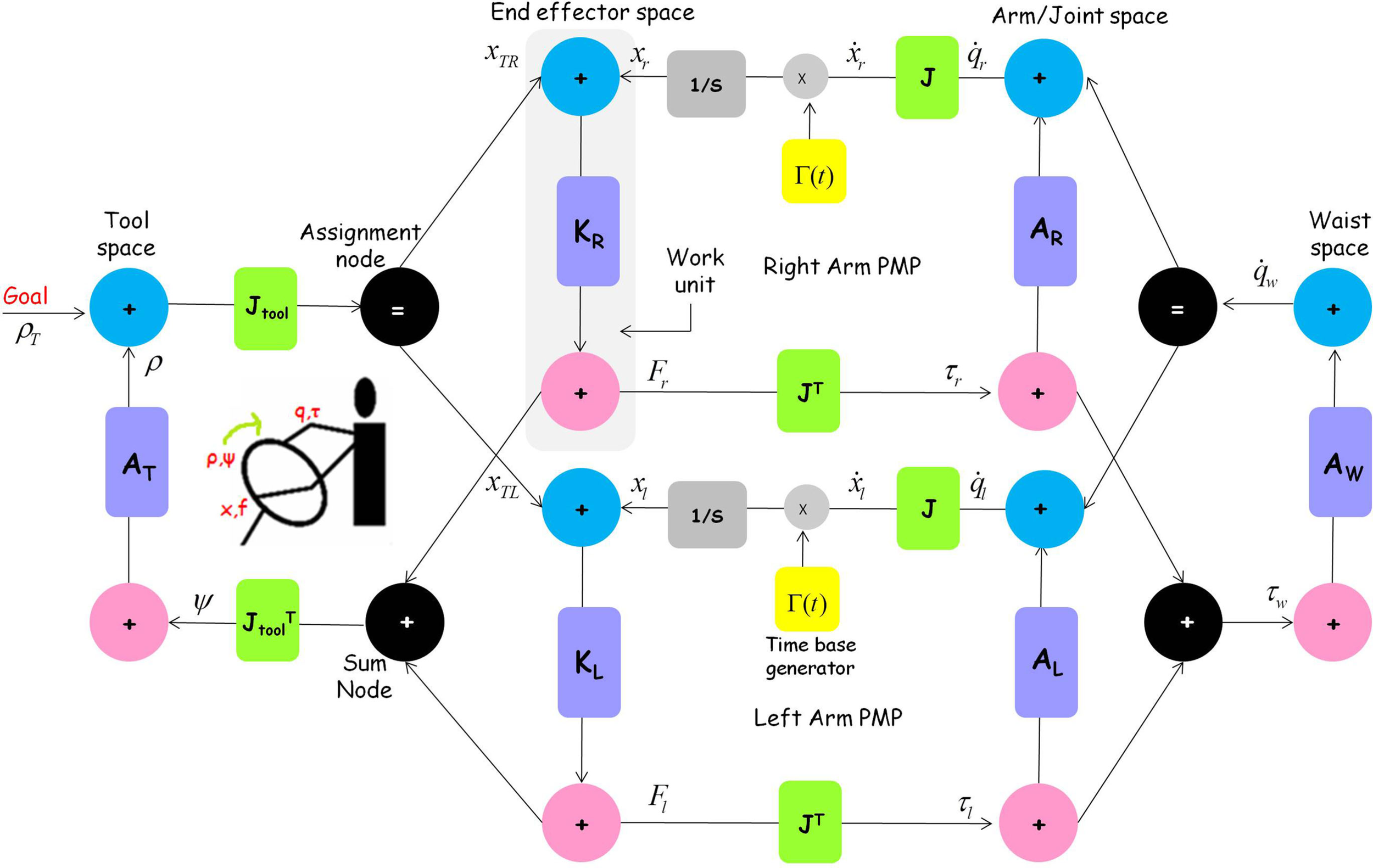 In complex kinematic structures, where there are several serial and parallel connections, two additional nodes, i.e., Sum (+) and Assignment (=) are used to “add or assign” displacements and forces from one motor space to another. For example, in Figure 3A the assignment node assigns the contribution of the waist (to the overall upper body movement toward a goal), to the right and left arm networks. On the other hand, the net torque seen at the waist is the “sum” of torques coming from the right and left arm PMP sub-networks (because of the individual force fields experienced by the right and left arms respectively). Sum and assignment nodes are dual in nature. If an assignment node appears in the displacement transformation between two WU, then a sum node appears in the force transformation between the same WU’s. This can be understood as a consequence of conservation of energy between two WU’s. Further, sum and assignment nodes can also appear at the interface between the body and a tool, in order to assign/sum forces and displacements from the external object to the end-effectors and vice versa (like in Figure 2).