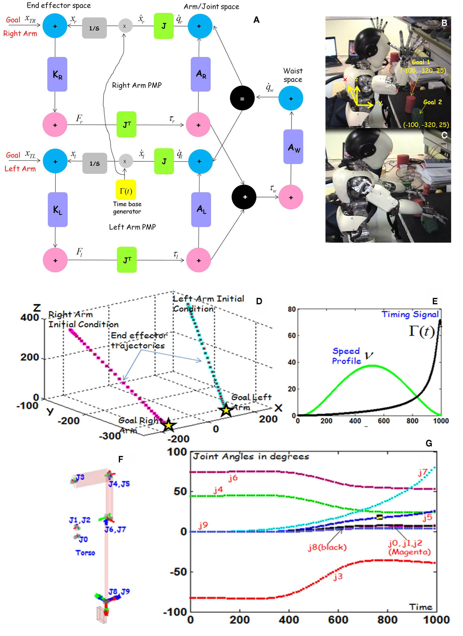 Bimanual coordination task of reaching two objects at the same time. (A) PMP network for the upper body with two target goals and a single time base generator. The network includes three modules: (1) Right arm, (2) Left arm, (3) Waist. The dimensionality of JR and JL is 3 × 10 (this includes the seven DoF’s of the arms and the three DoF’s of the waist). The dimensionality of Aj is 7 × 7 and of AT is 3 × 3. The three sub-networks interact through a pair of nodes (“assignment” and “sum”) that allow the spread of the goal-related activation patterns. (B,C) Show the initial and the final posture of the robot and the two target objects. (D,E) Show the trajectories of the two end-effectors and the corresponding speed profiles (together with the output Γ(t) of the time base generator). (F) Clarifies the intrinsic degrees of freedom in the right arm-torso chain. (G) Shows the time course of the right-arm joint rotation patterns: J0–J2: joint angles of the Waist (yaw, roll, pitch); J3–J9: joint angles of the Right Arm (shoulder pitch/yaw/roll; elbow flexion/extension; wrist prono supination pitch/yaw).