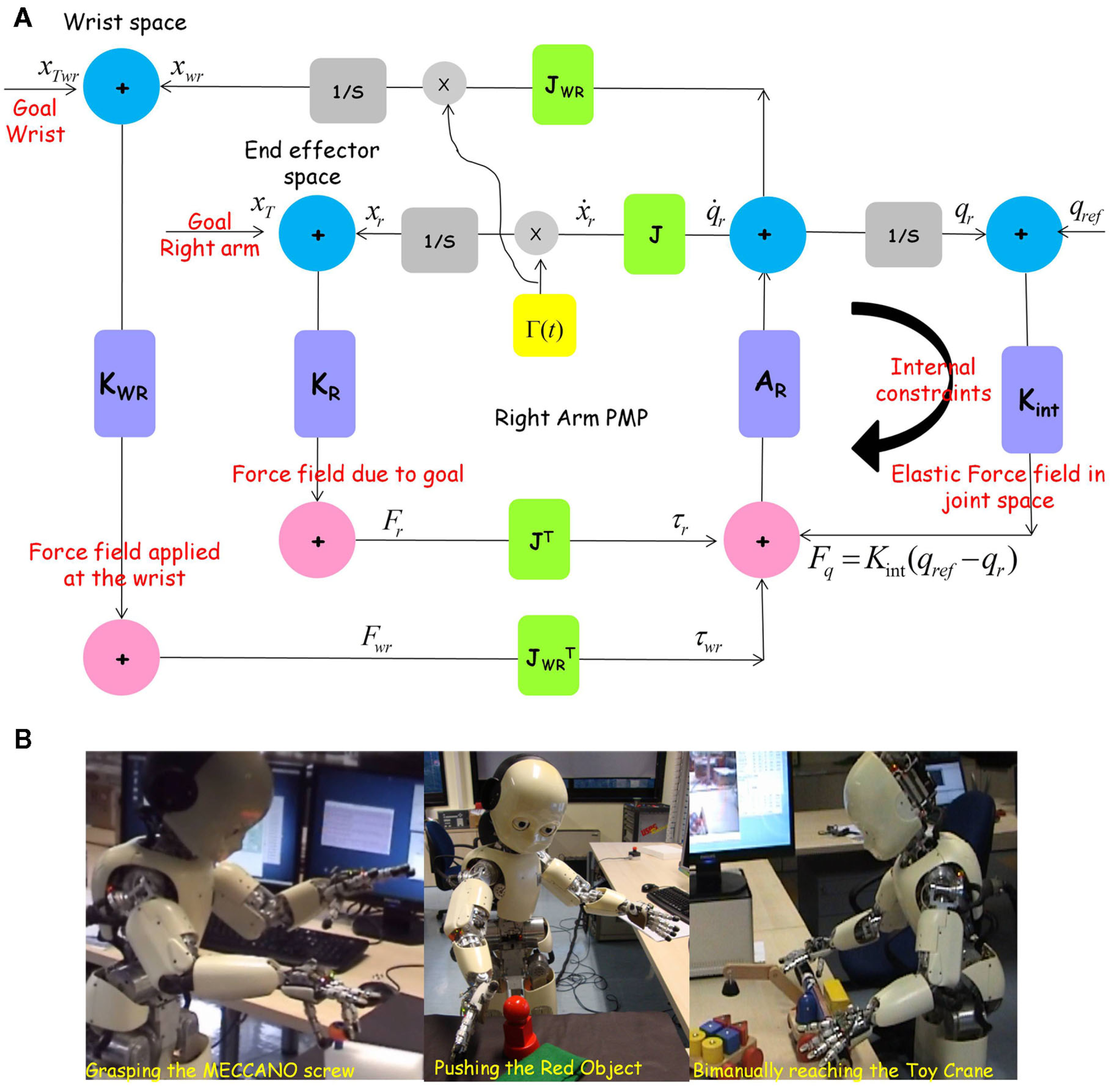 A constraint in the extrinsic space could be an obstacle to avoid, an appropriate hand pose with which to reach an object so as to allow further manipulation actions to be performed (like grasp or push). In the intrinsic space a constraint could take into account the limited range of motion of a joint, the saturation power or torque of an actuator etc. Figure 5A shows a composite PMP network for the right arm kinematic chain, for reaching an object (Goal) with an appropriate wrist orientation/hand pose to support further manipulations (constraint 1) and generating a solution such that the joint angles are well within the permitted range of motion (constraint 2). Hence, in the PMP network of Figure 5A there are three weighted, superimposed force fields that modulate the spatio-temporal behavior of the system: (1) the end-effector field (to reach the target); (2) the wrist field (to achieve the specified hand pose); (3) the force field in joint space for joint limit avoidance. Note that the same timing signal Γ(t) synchronizes all the three relaxation processes. Figure 5B shows results of iCub performing different manipulation tasks driven by such a network.