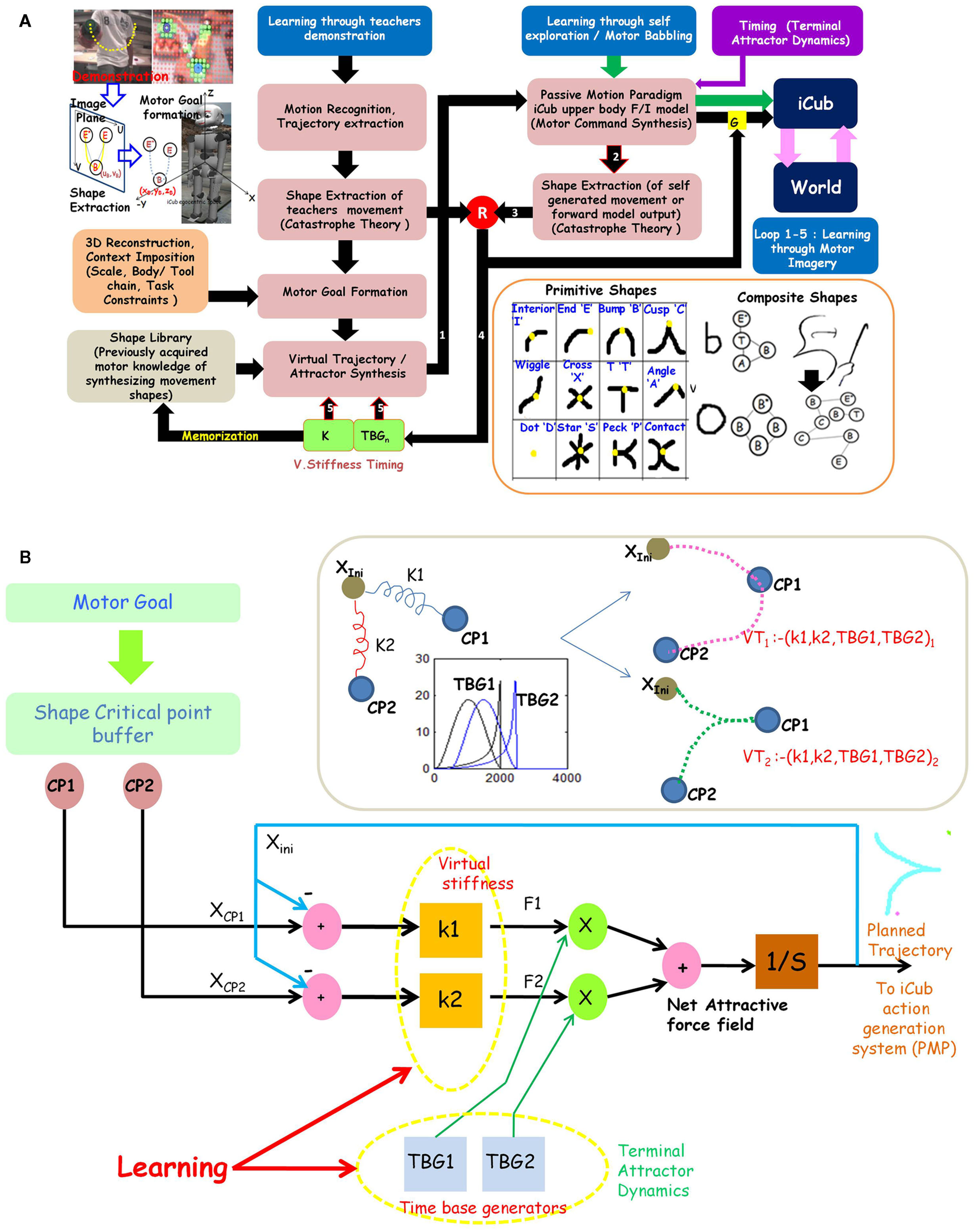 (A) Motor Skill learning and Action generation architecture of iCub: Building blocks and Information flows. (B) Scheme of the virtual trajectory synthesis system (modeled by Eq. (5)), that transforms a discrete set of critical points (shape “type” and its “spatial location”) in the motor goal into a continuous sequence of equilibrium points that act as moving point attractor to the task relevant PMP network. An elastic force field is associated to each spatial location (in the motor goal), with a strength given by the stiffness matrices (K1 and K2). The two force fields are activated in sequence, with a degree of time overlap, as dictated by two time base generators (TBG1 and TBG2). Simulating the dynamics with different values of K and γ, results in different trajectories through the critical points. Inversely, the problem of learning is to acquire the correct values for K and γ (virtual stiffness and temporal overlap) such that the shape of the resulting trajectory correlates with the shape description in the motor goal.