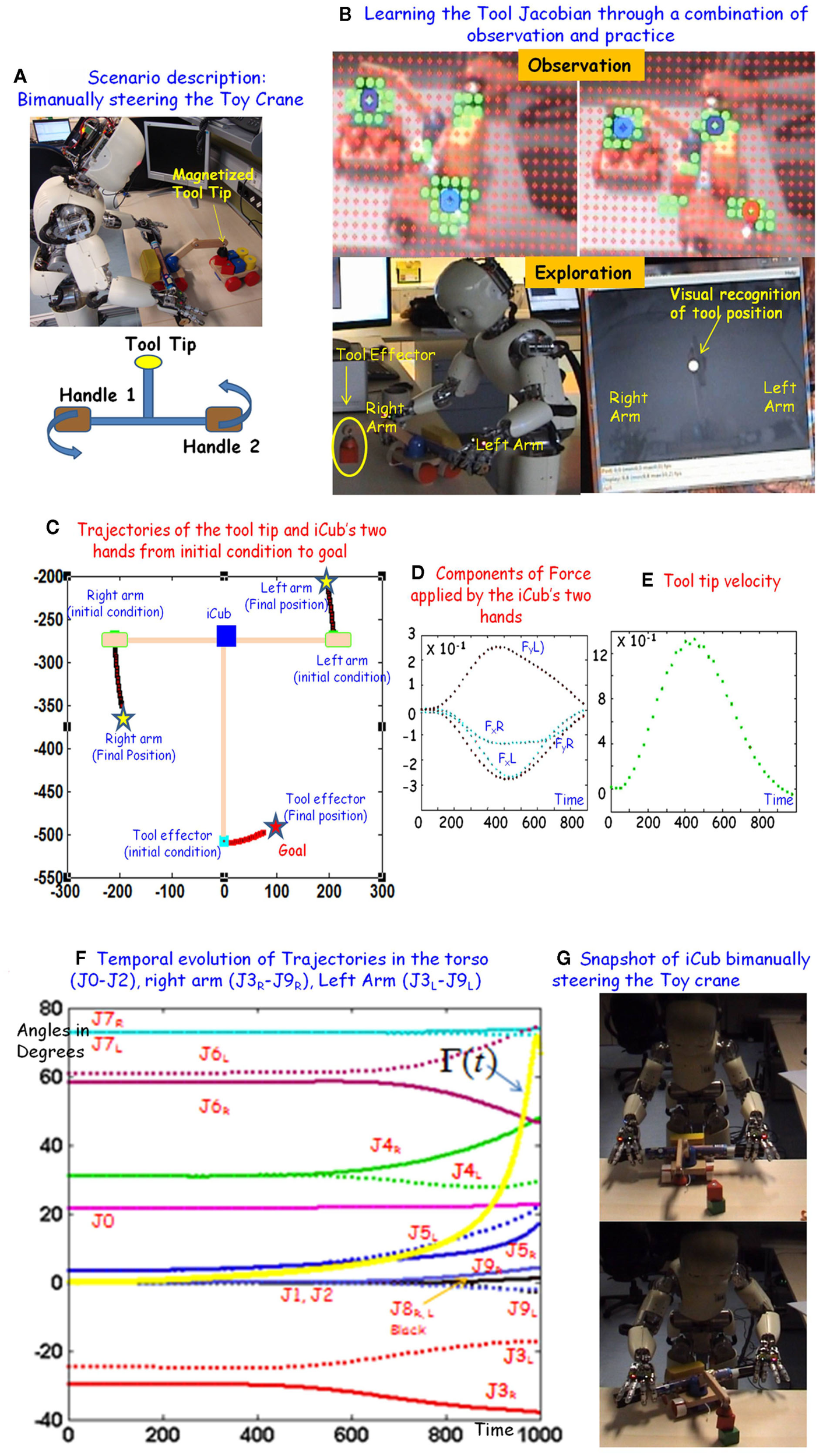 In the context of PMP, when we learn a motor skill, we basically learn the connecting links in the PMP network associated with the task (i.e., vertical links or impedances, horizontal links or Jacobians, and the timing of the time base generators). We will describe central ideas using a new scenario where iCub learns to bimanually steer a toy crane in order to position its magnetized tip at a goal target (Figure 7A). We choose this example because the task is similar to the bimanual control of the steering wheel, the steering wheel replaced by the two handles of the toy crane. So the structure of the PMP network is the same as shown in Figure 2. In general, while learning to control the toy crane, iCub has to learn: (a) the appropriate stiffness and timing to execute the required “spatio-temporal” trajectories using the body + tool chain (for example, performing synchronized quasi-circular trajectories with both hands while turning the toy crane) and (b) while performing such coordinated movements with the tool, learn the Jacobians that map the relationship between the movements of the body effectors and the corresponding consequence on the tool effector (the magnetized tip). The third issue is of course related to using this learnt knowledge to generate “goal directed” body + tool movements (given a goal to reach/pick up an otherwise “unreachable” environmental object using the toy crane).
