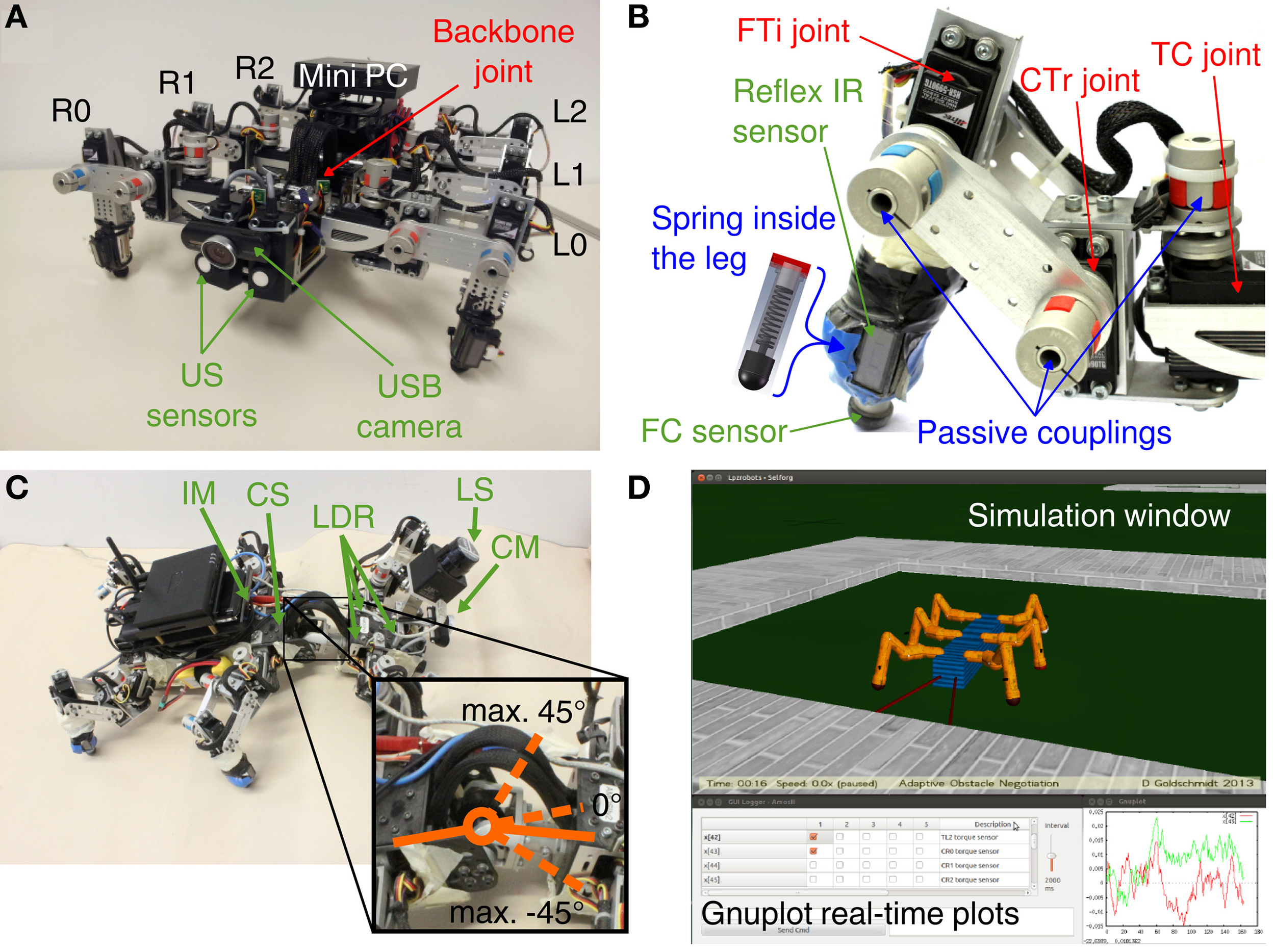 Biologically-inspired hexapod robot AMOS II. (A) Sensors and leg configuration of AMOS II (front view). (B) Motor, sensor and passive component configuration of an AMOS II leg (R0). (C) Example of flexion and maximum range of the backbone joint and additional sensors of AMOS II. (D) Robot simulation toolkit LpzRobots with GUI and real-time plots. Abbreviations: L0, R0 = left and right front legs, L1, R1 = left and right middle legs, L2, R2 = left and right hind legs.