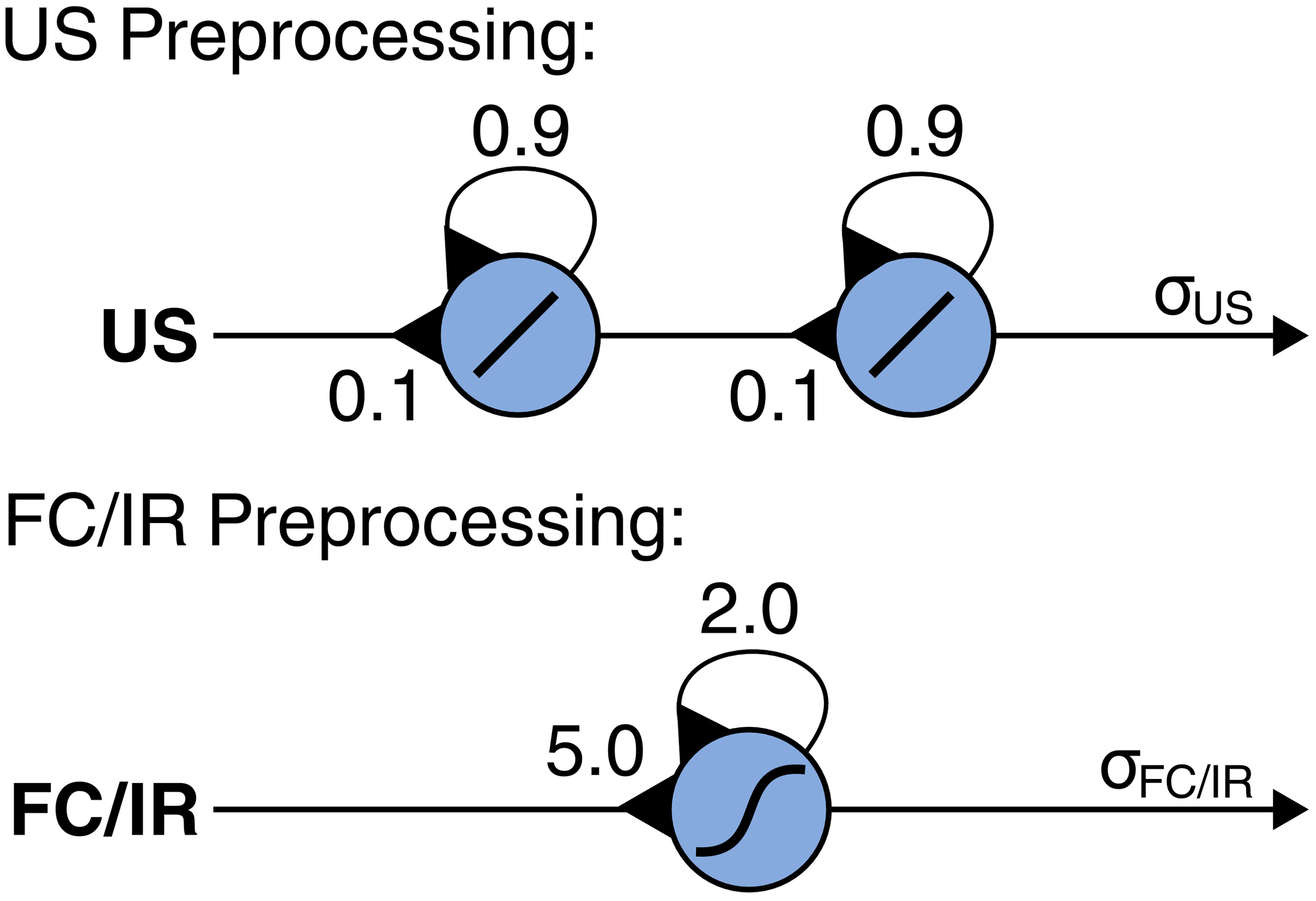 Recurrent neural modules for signal preprocessing of ultrasonic (US), foot contact (FC), and infrared (IR) sensors. US preprocessing applies two recurrent neurons using a linear transfer function where the incoming connection weights are set to 0.1 while the recurrent weight of each neuron is set to 0.9. FC and IR preprocessing modules both apply a single recurrent neuron using a hyperbolic transfer function where the incoming connection weights are set to 5.0 and the recurrent weights are set to 2.0. The neural parameters of all sensory preprocessing modules were chosen empirically.