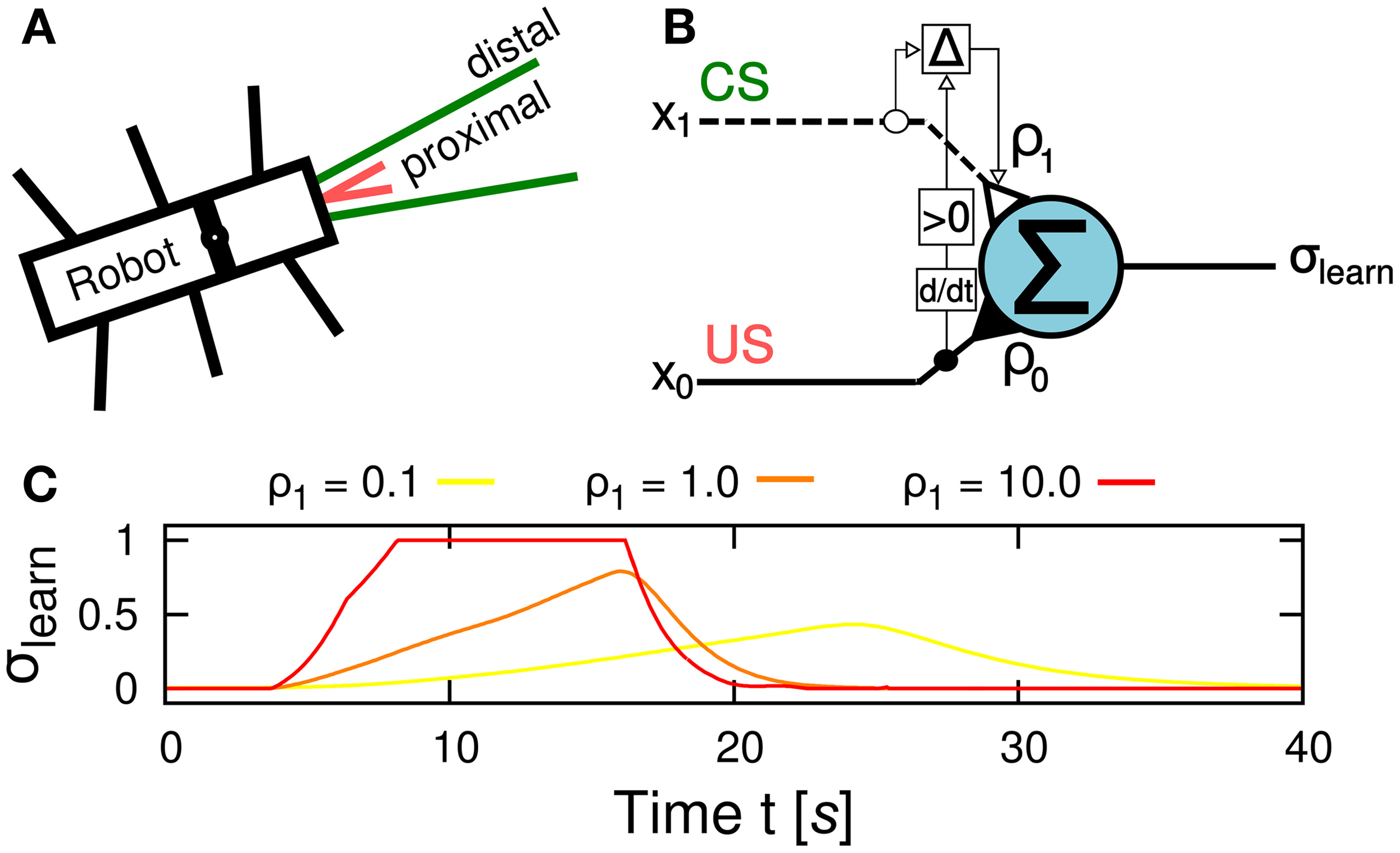 The learning goal in this study is to learn to efficiently negotiate an obstacle. This entails learning to tilt the front body part upwards early enough to avoid running into the obstacle. Preprocessed sensory signals coming from the US sensors at the front of the robot serve as input signals for the learning circuit. The US signal is divided into a proximal and a distal range (Figure 4A) leading to an early, predictive signal x1 and a late, reflex signal x0, respectively, as the robot approaches an object. While x1 is equal to the US signals fed into the circuit, x0 is only active when the US signals surpass a certain threshold Θ = 0.85 and is then mapped onto the interval [0,1]. The learning circuit employs a correlation-based, differential Hebbian learning rule called input correlation (ICO) learning (Porr and Wörgötter, 2006) to modify a plastic synapse ρ1 during learning (Figure 4B). It consists of an integrating output neuron that applies a linear transfer function. The neuron sums up the weighted input signals x0(t) (reflex signal) and x1(t) (predictive signal), thus the output signal σlearn is given by: