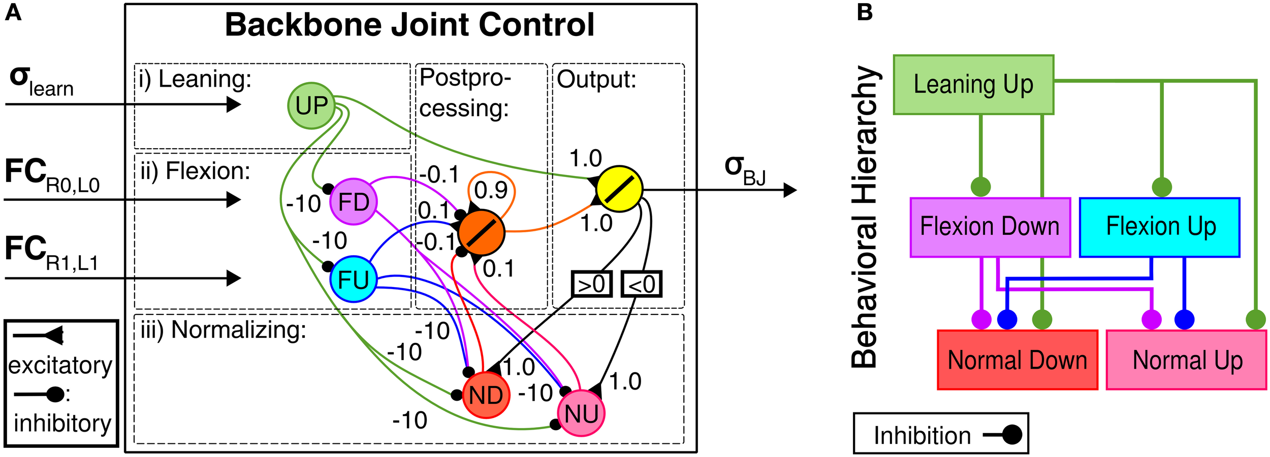 Backbone Joint Control (BJC). (A) Neural module for BJC. It receives preprocessed sensory input signals from ultrasonic (US) and foot contact (FC) sensor. Five input neurons are connected to an output neuron which signal σBJ directly drives the backbone joint. (B) Behavior-based, hierarchical topology of BJC. Lower ordered behaviors are surpressed through inhibitory synapses.