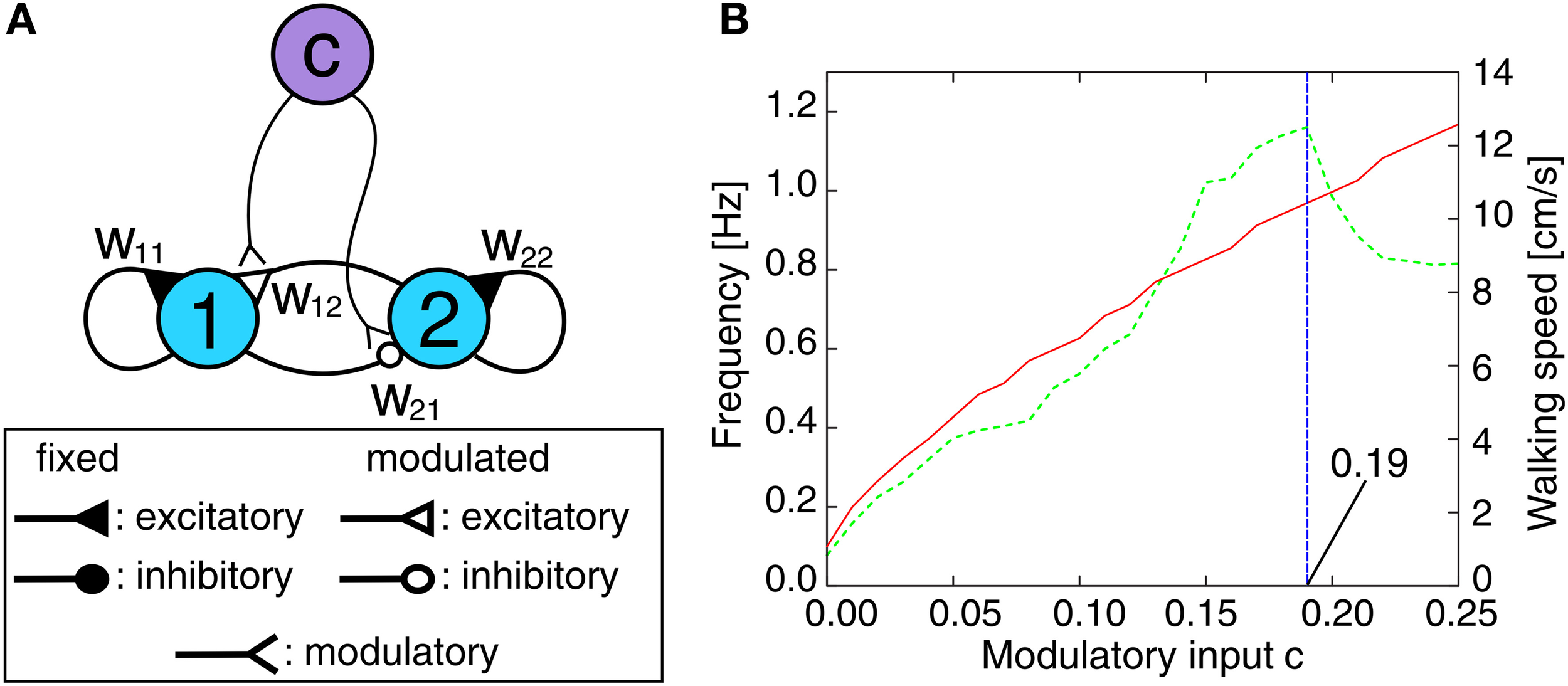 Neuromodulated CPG mechanism. (A) CPG circuit diagram for periodic pattern generation. The synaptic weights w12 and w21 are modulated by an extrinsic control input c, i.e., w12 = 0.18 + c = −w21. The fixed synaptic weight are set to w11 = w22 = 1.4. (B) The eigen frequency of the resulting CPG output signals (red solid line, left y-axis) and the corresponding walking speed of AMOS II (green dashed line, right y-axis) with respect to the modulatory control input c. The sample interval of c is Δc = 0.01. For negative values of c the network dynamics exhibits solely fixed point attractors instead of periodic or quasi-periodic ones. Note that the updating frequency is approximately fTS ≈ 27 Hz which corresponds to a time step interval of t ≈ 0.037 s.