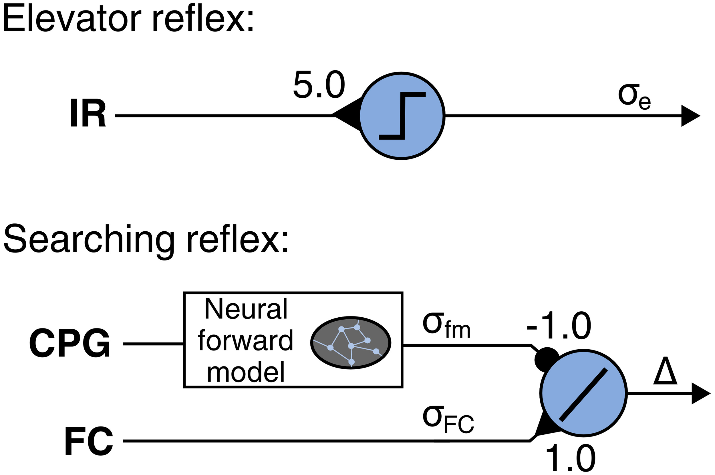 Neural modules for local leg reflexes: searching and elevator reflex. A neural forward model is applied to determine expected foot contact signal from leg motor pattern provided by the CPG. The additive neuron accumulates positive errors which cause vertical shifting of the CTr and FTi signals, resulting in searching reflex. A preprocessed infrared reflex signal are fed into a neuron using a linear threshold transfer function. The threshold is set to 0.01. The output signal σe shifts the CTr and FTi signals upwards. As a result, the leg is elevated. Note that each leg has its own searching and elevator reflex modules.