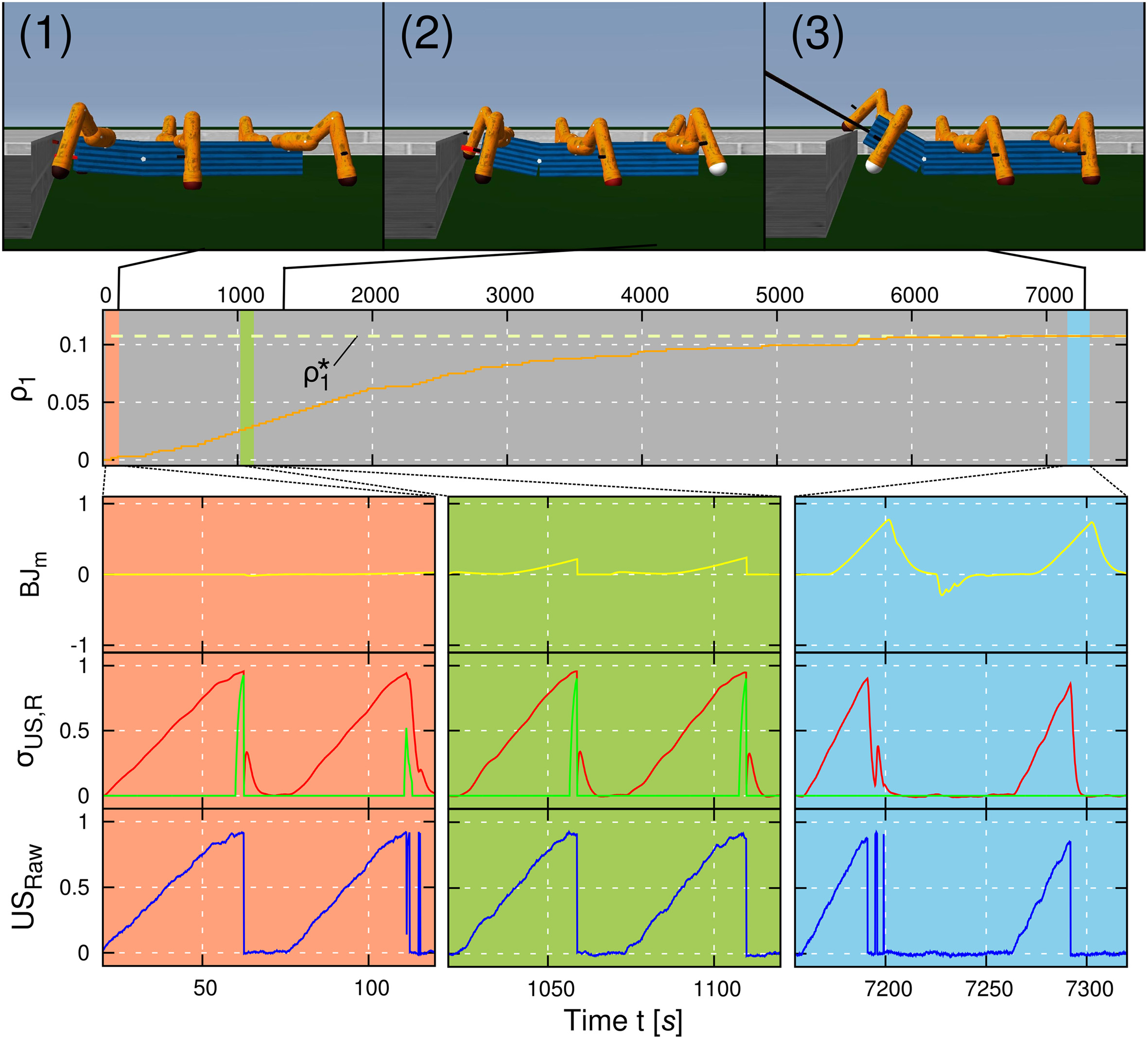 Learning curve of a negotiation of an obstacle with a height of 8 cm. The weight ρ1 (orange line) changes according to the ICO learning rule, i.e., due to correlations of the predictive signal (red line) and the reflex signal (green line). In the beginning of the experiment, the backbone joint (BJm, yellow line) does not exhibit any behavior because of a small weight ρ1 (see salmon colored area, photo 1). With an increasing weight ρ1, the amplitude as well as the slope of the backbone joint motor output increases (see olive colored area, photo 2). After learning, ρ1 has converged toward a value ρ*1 (dashed line) for which the robot generates an optimal backbone joint motion, i.e., an optimal leaning behavior (see sky blue colored area, photo 3). The convergence is due to the fact that the reflex signal is avoided such that it does not occur after learning. Raw data (USraw, blue line) coming from the ultrasonic (US) sensors is also shown. Note that all graphs illustrated in this figure correspond to the right US sensor. The learning curve of signals coming from the left US sensor shows a similar behavior. The learning rate is set to μ = 0.01.