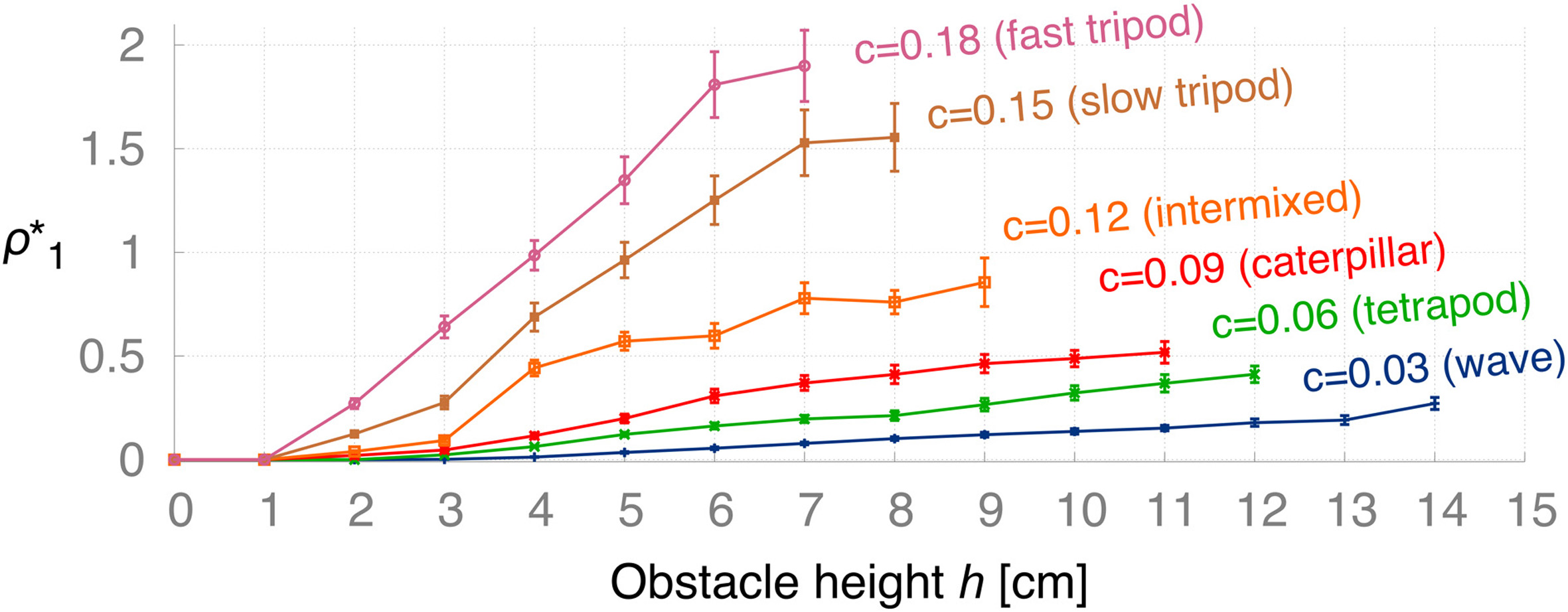 Average learned weights ρ*1 (±SD) with respect to the obstacle height h for different gaits: wave (c = 0.03), tetrapod (c = 0.06), caterpillar (c = 0.09), intermixed (c = 0.12), slow tripod (c = 0.15), and fast tripod (c = 0.18) gait. For increasing h and c the learned weights converge to higher values, respectively. For the more unstable, faster gaits the learning algorithm does not converge due to instabilities during climbing. However, these non-convergences correspond to the maximum obstacle height that the robot is able to achieve for given gaits (see Figure 12).