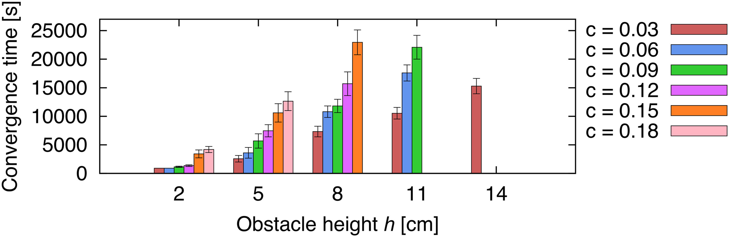 Average convergence times for five selected heights using different gaits. Five different obstacle heights (h = 2, 5, 8, 11, 14 cm) were selected using the set of gait parameter as described in Figure 9 to compare the average convergence times (±SD) of 20 learning trials.