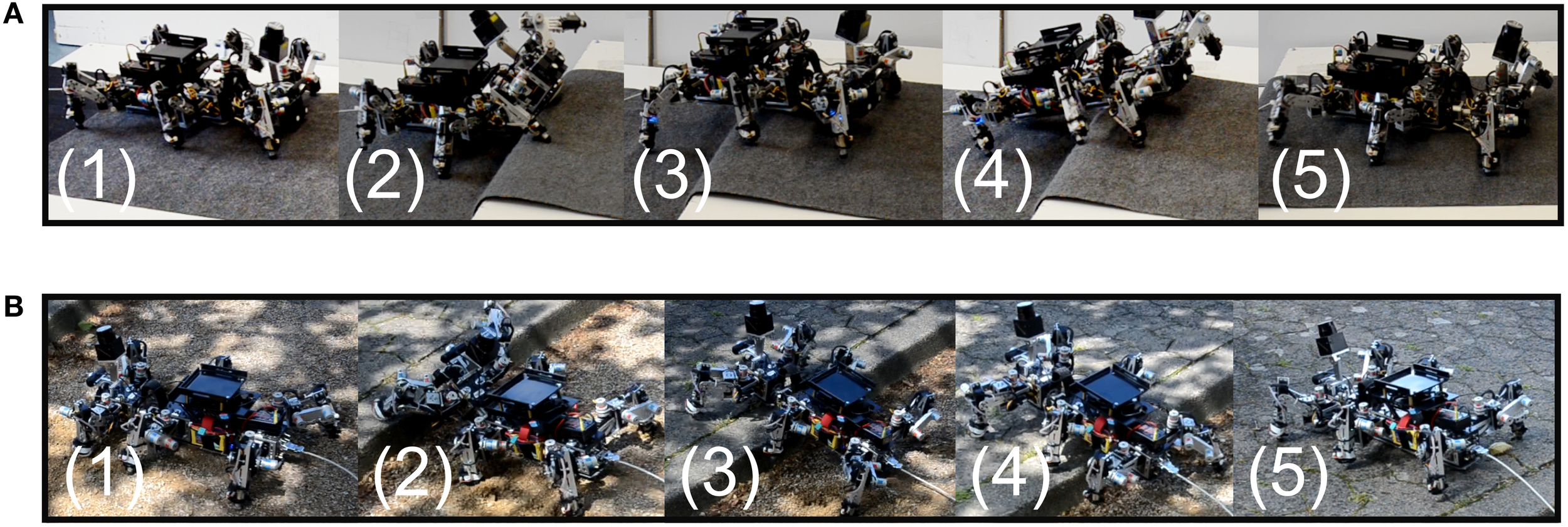 Obstacle negotiation behavior in hexapod robot AMOS II over large obstacles in an (A) indoor and (B) outdoor environment.