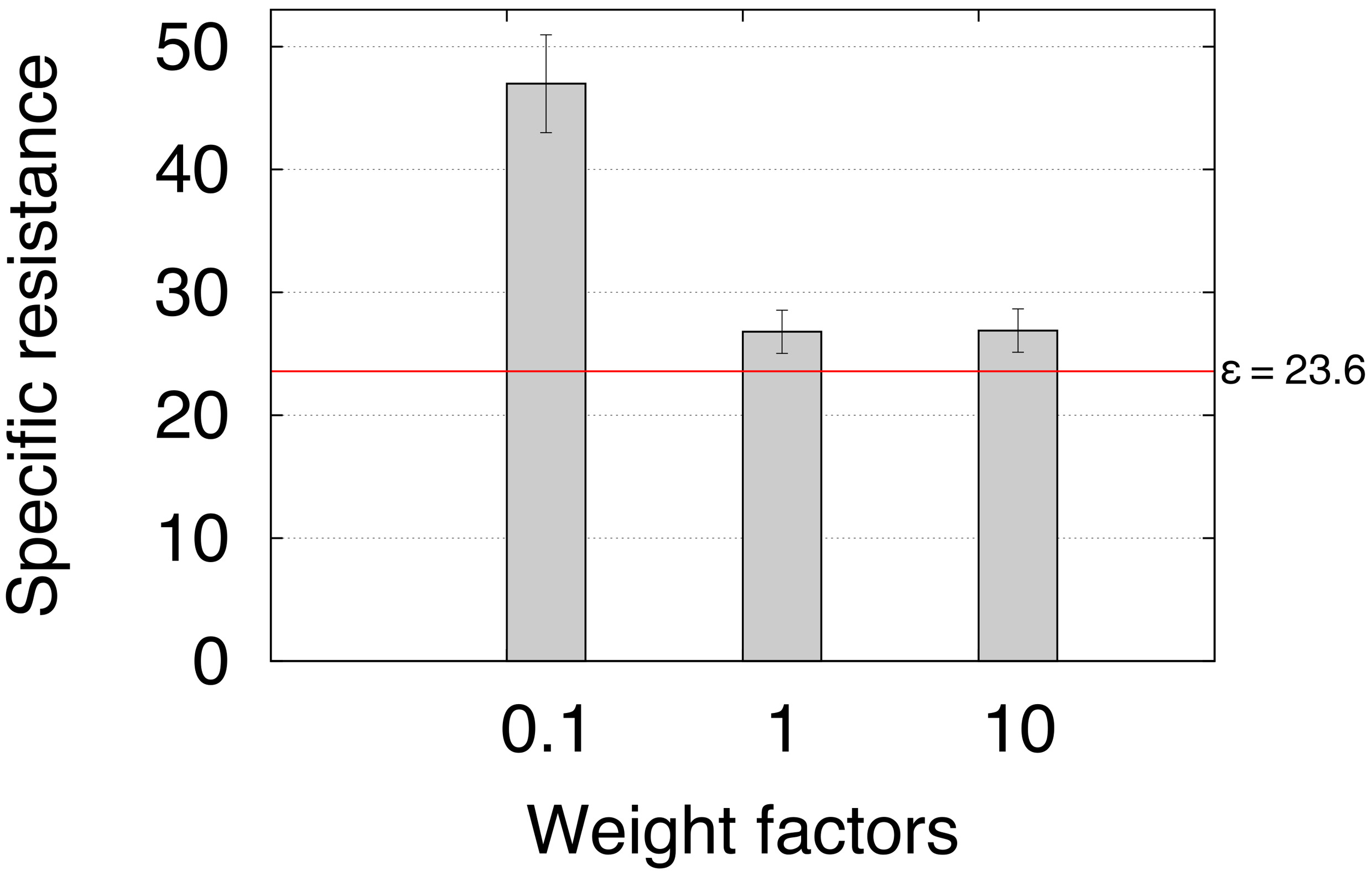 Average specific resistance for the three different weight factors. The specific resistance has been determined by measuring power consumption and travel time (see Table 1) of a 1 m distance with an obstacle on the way. The results suggest that a certain degree of backbone joint motion is necessary to produce energy-efficient obstacle negotiation behavior. The red line denotes the specific resistance for walking a 1 m distance without an obstacle in the way.